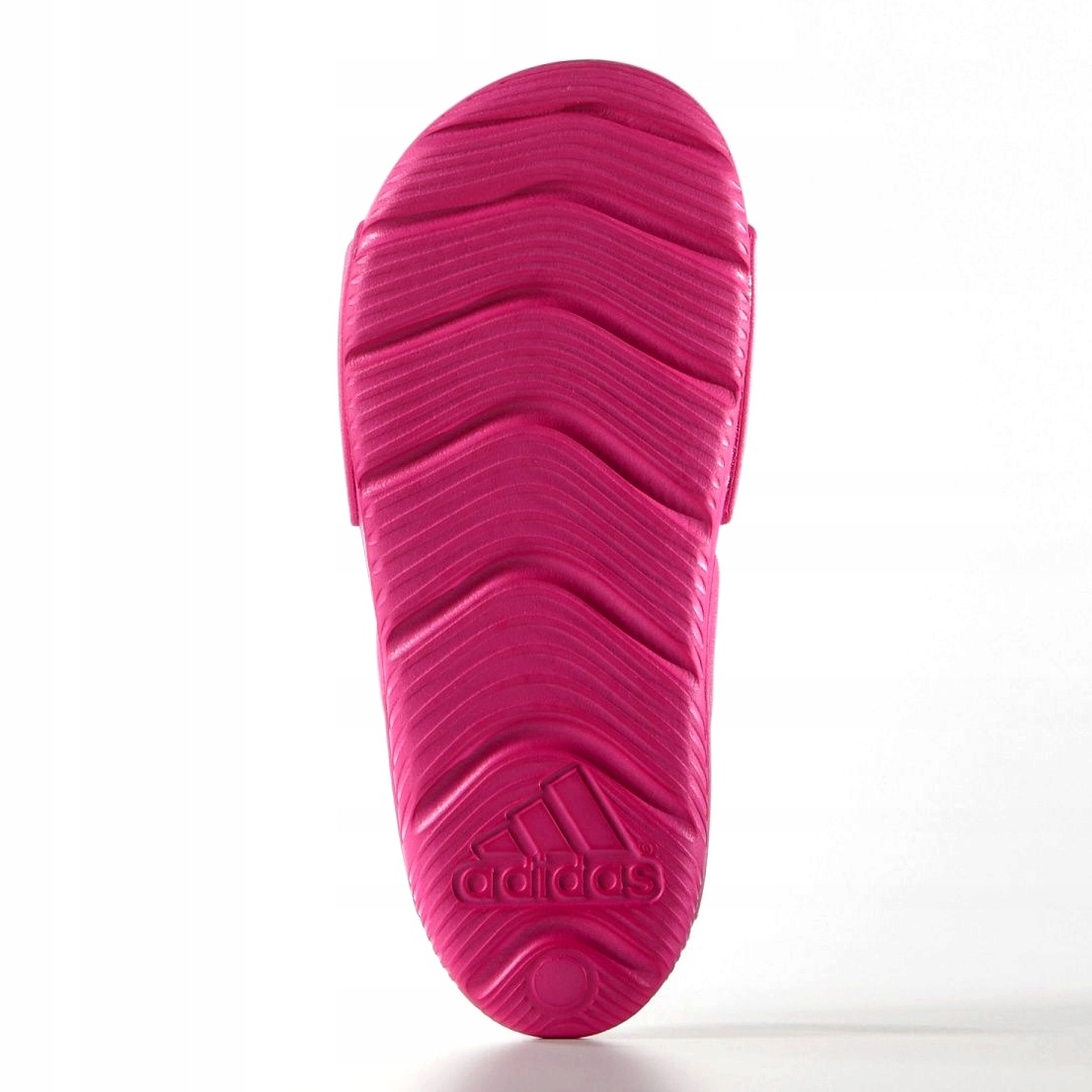 Die modische rosa Farbe der Sandalen wurde mit weißen Accessoires und den charakteristischen drei Adidas-Streifen angereichert, die ihnen einen sportlichen Charakter verleihen. Mit einem kleinen weißen Herstellerlogo ganz vorne werden diese Sandalen zum Lieblingsmodell jedes Mädchens.