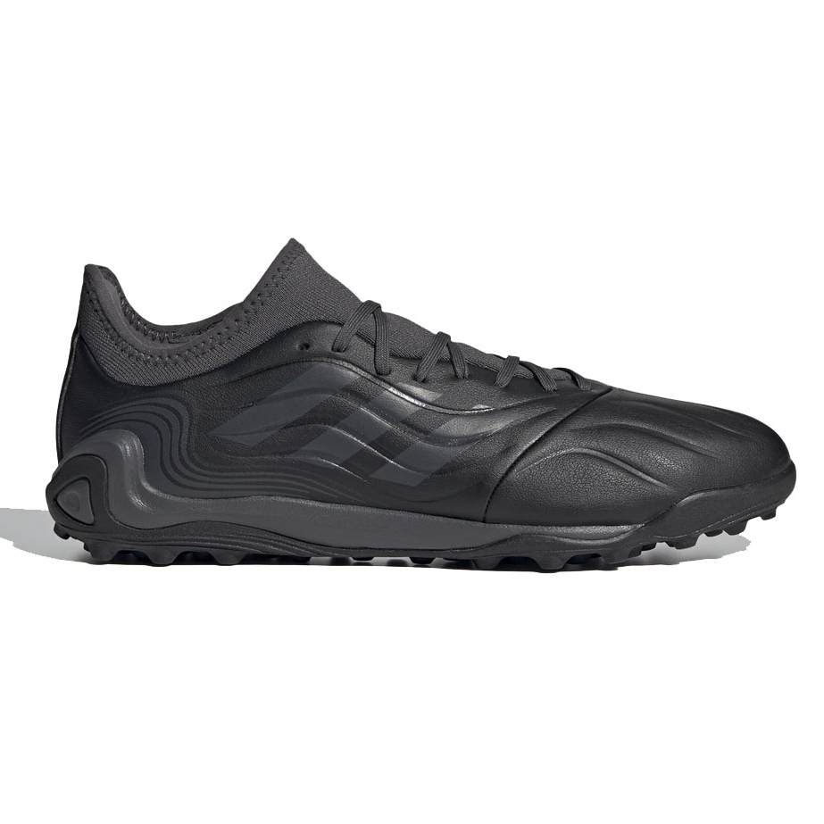 Adidas Copa Sense.3 TF FW6530 Fußballschuhe - Klassiker und Komfort auf künstlichen Oberflächen. Schwarzer, eleganter Rasen kombinieren natürliche Haut im Obermaterial mit einer Textilplatte um den Knöchel und ein Stück, wobei die Zunge anpasst, was sicherstellt, dass der Fuß und der Komfort während des Spiels eingehalten werden. Die Sohle mit Gummi -Stiften wurde für das Spielen auf Rasenflächen entwickelt, die einen guten Griff und die Stabilität von Bewegungen verleihen.