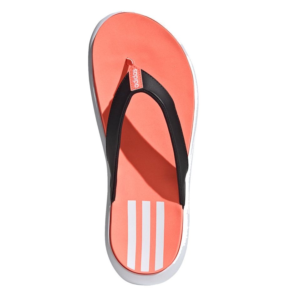 Adidas Comfort zehenstegsandalen EG2064 Klappen kombinieren Sportkomfort mit einem modischen, kontrastierenden Aussehen (schwarz mit orange und weißer Akzente). Die eingefügte Struktur und ein weicher Einsatz bieten Komfort während der Spaziergänge, die am Pool- oder Strandtagen ruhen.