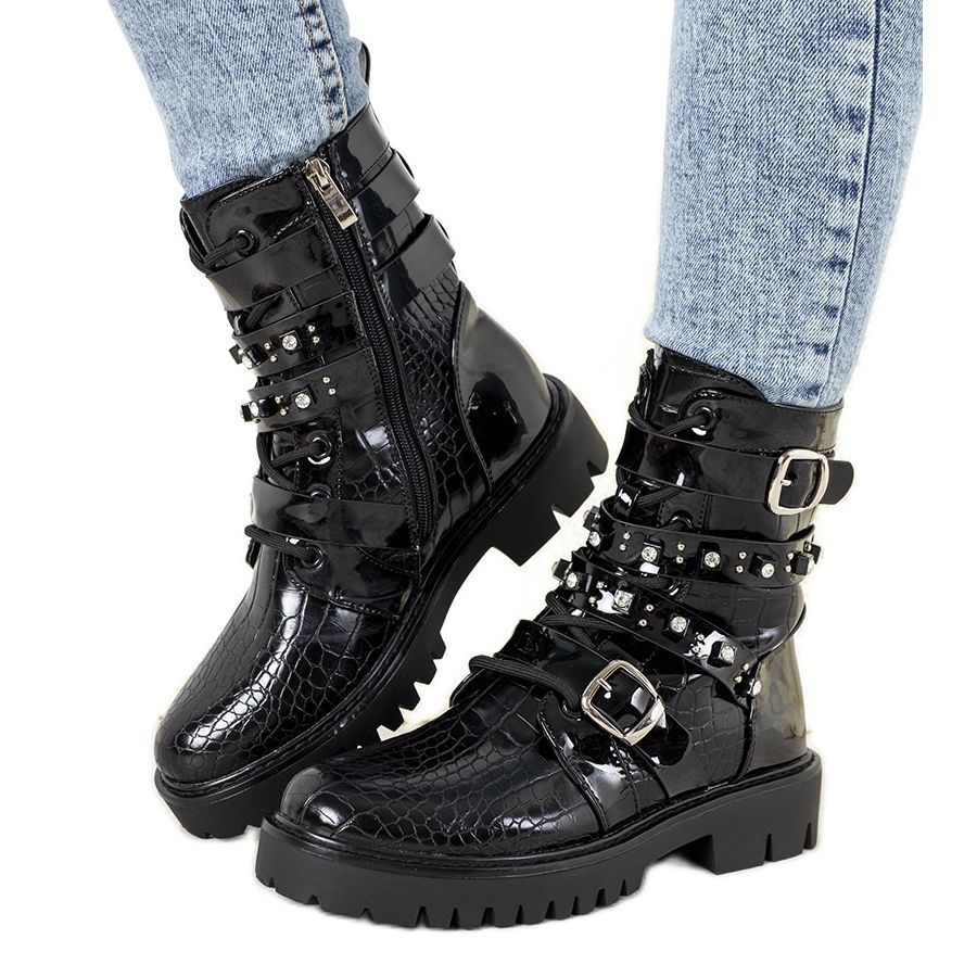 Ein echter Hit dieser Saison sind schwarze flache Albertine-Stiefeletten aus Lack, die perfekt zu den neuesten Modetrends passen. Diese stilvollen Schuhe aus hochwertigem Öko-Lackleder ziehen die Blicke durch krokodilartige Einsätze auf sich, die einen einzigartigen Charakter verleihen.