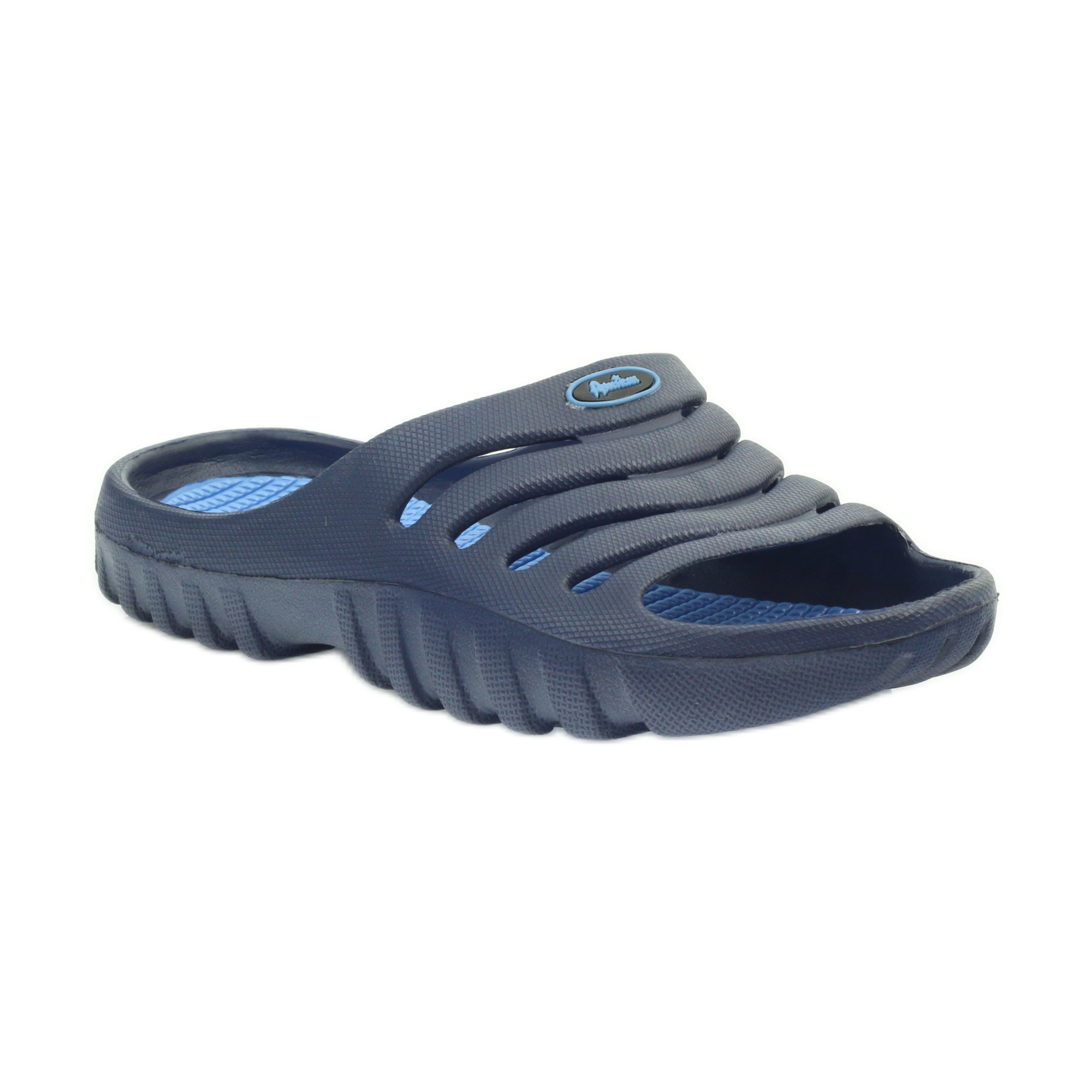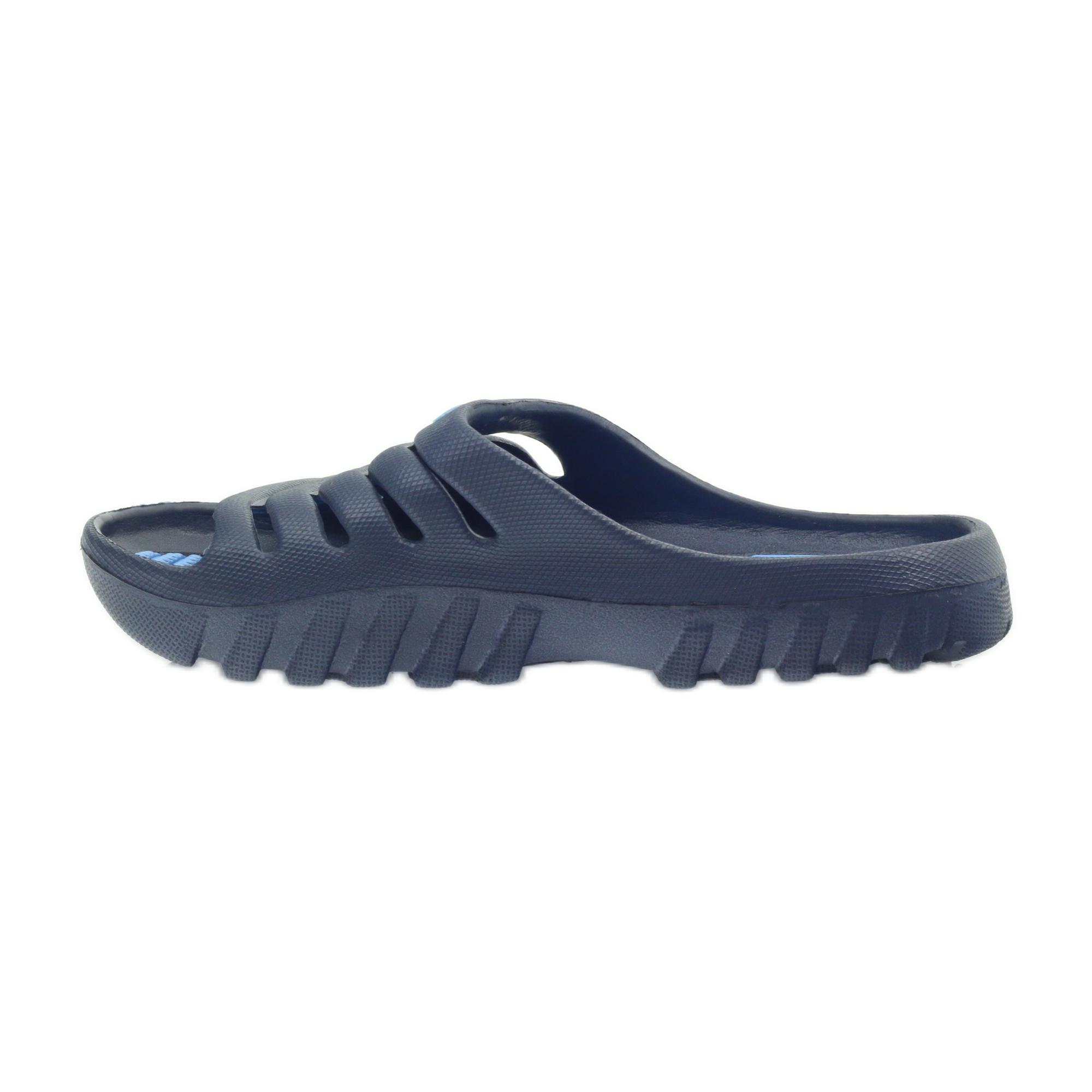 Diese marineblauen zehenstegsandalen zeichnen sich durch eine interessante Form des Obermaterials aus und das Logo des Herstellers verleiht ihnen Charakter. Die Innenseite der Schuhe in einem intensiven Blauton mit einer profilierten Sohle sorgt dafür, dass die Füße Ihres Kindes den ganzen Tag über ausreichend Halt und Komfort haben.