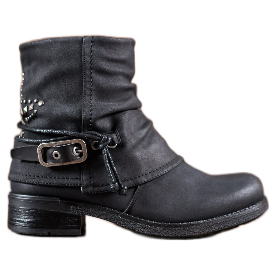 Ihr breiter, 5 cm hoher Absatz garantiert Komfort bei langen Spaziergängen und einzigartige Details, wie dekorative Riemen mit Schnallen und Strasssteine auf der Rückseite des Obermaterials, verleihen ihnen einen rockigen Charakter. Arbeiter haben eine runde Spitze, was sie nicht nur stilvoll, sondern auch bequem für die Füße macht.