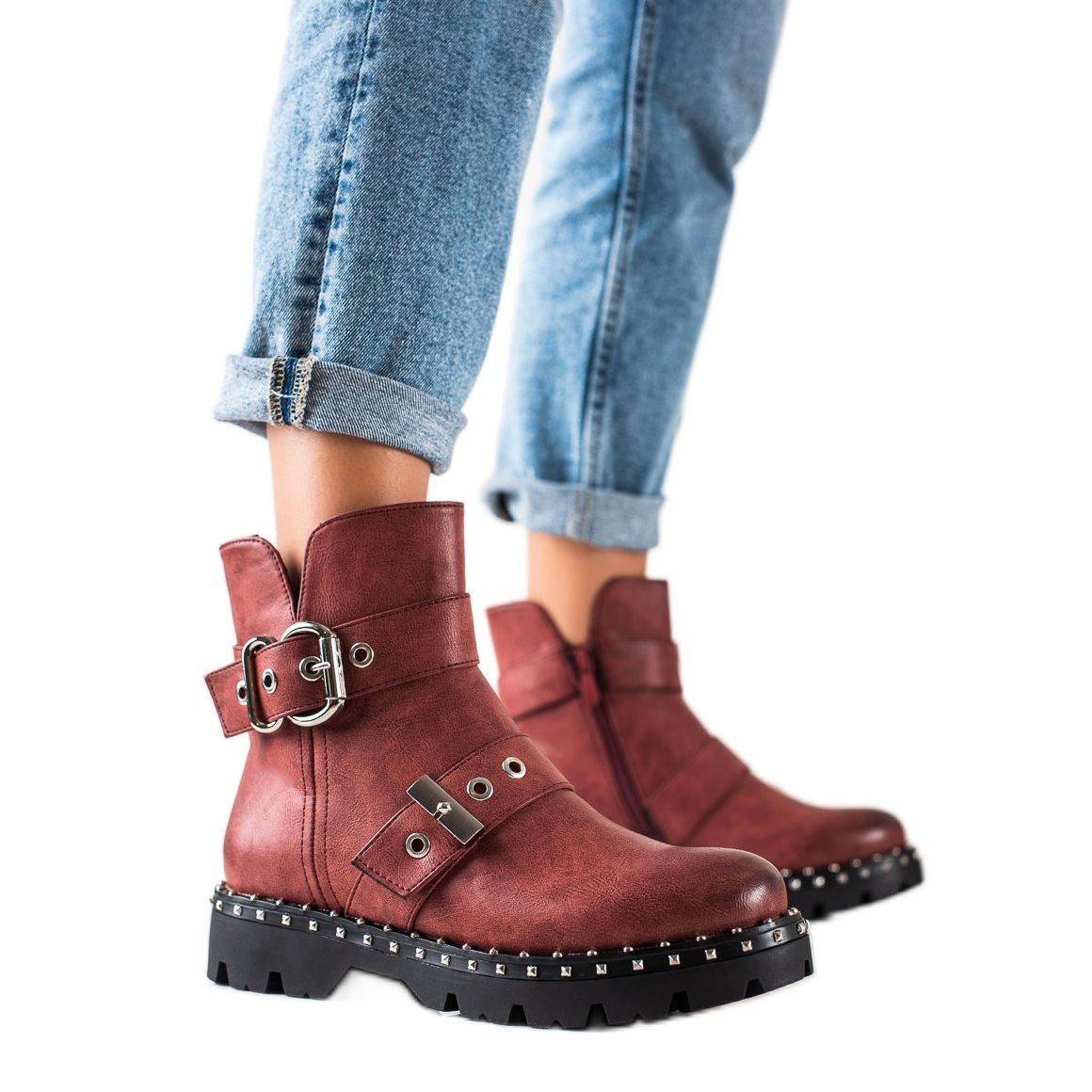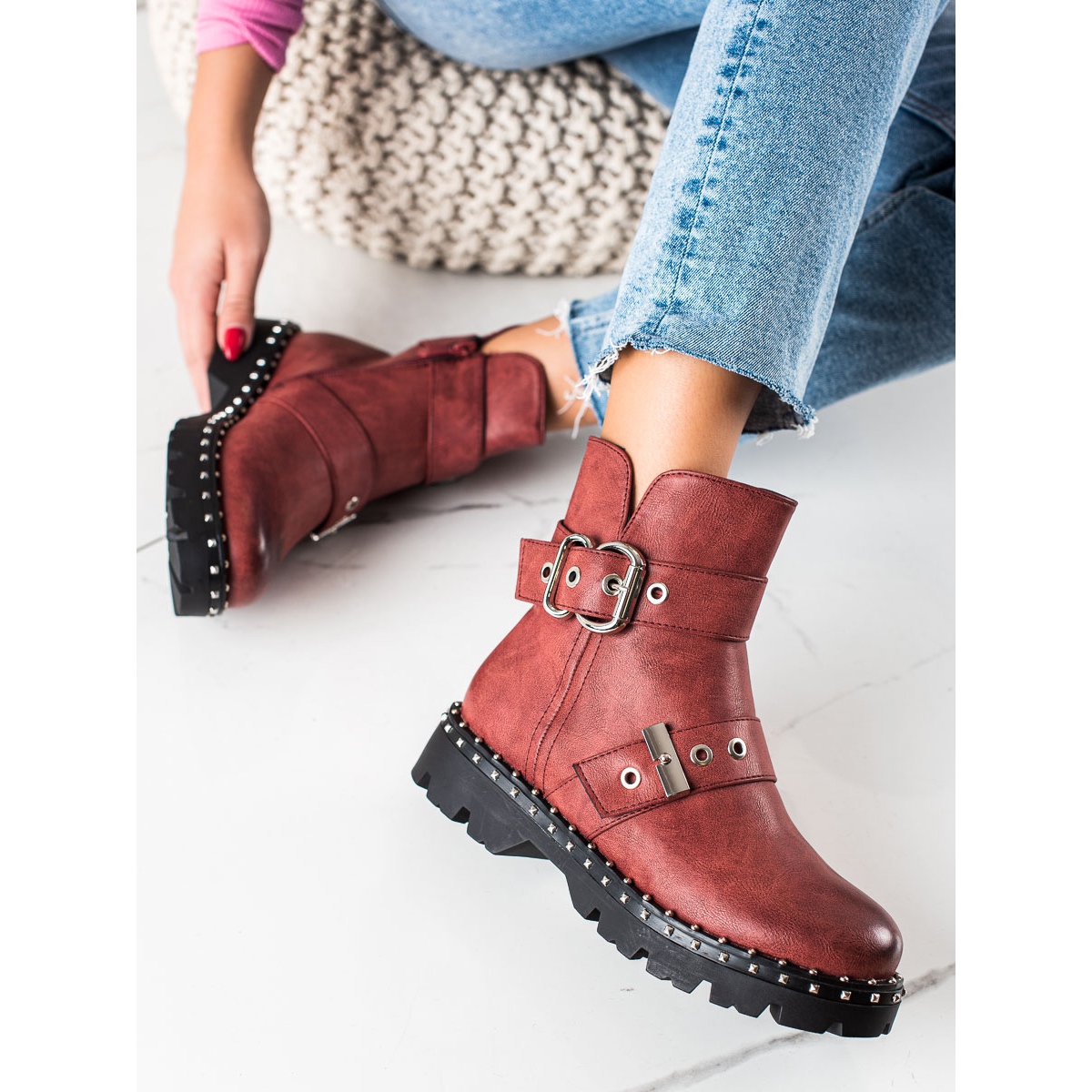 Entdecken Sie ein einzigartiges Stiefelettenmodell der Marke Janessa, das perfekt zu den neuesten Trends passt. Diese roten Arbeiterstiefel mit Strasssteinen sind die perfekte Kombination aus lässigem Stil und rockigem Akzent, der Ihrem Alltags-Styling Charakter verleiht.