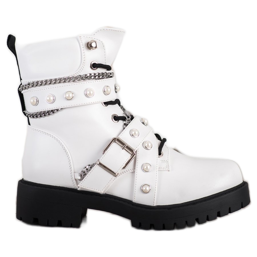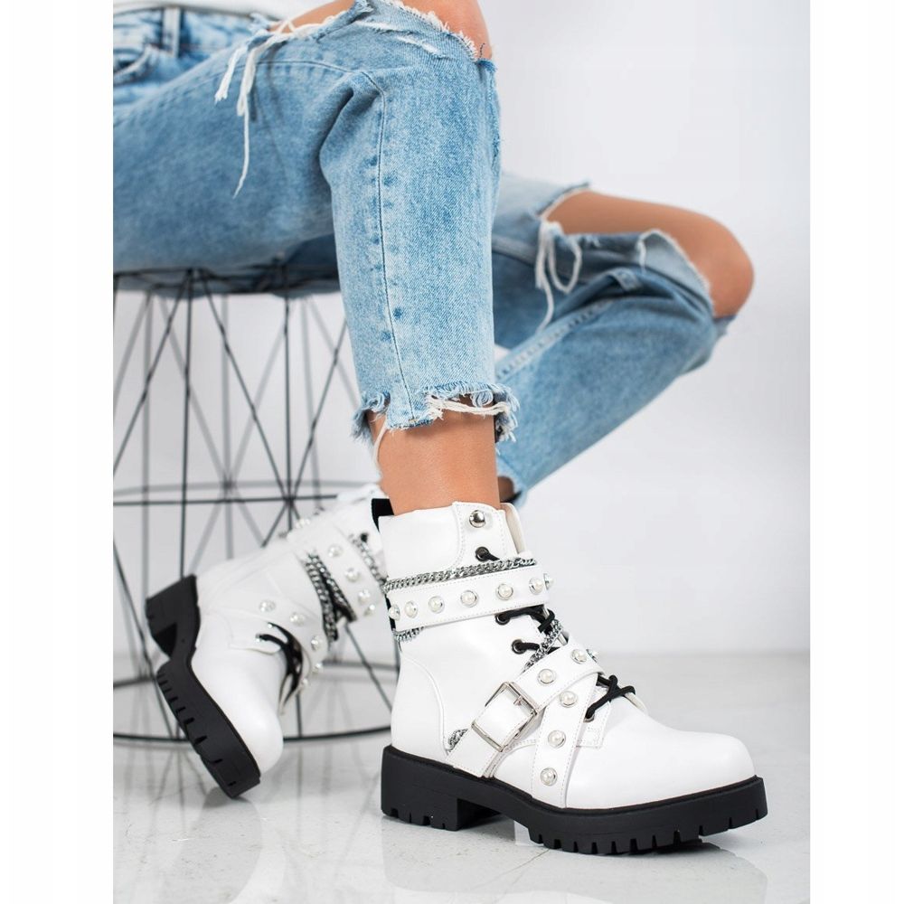 Wir präsentieren Seastar Workers with Chains in elegantem Weiß, die lässigen Stil mit rockigem Touch verbinden. Diese Bovver-Stiefel für Damen sind dank der Innenisolierung, die für Komfort und Wärme sorgt, die perfekte Wahl für kältere Herbst- und Wintertage.