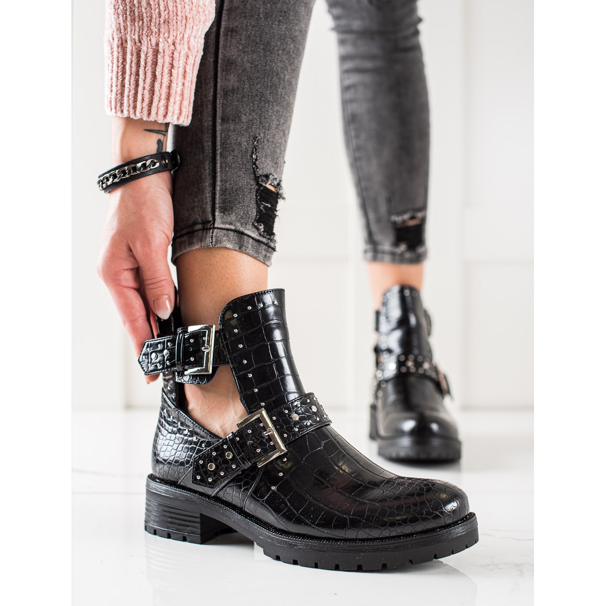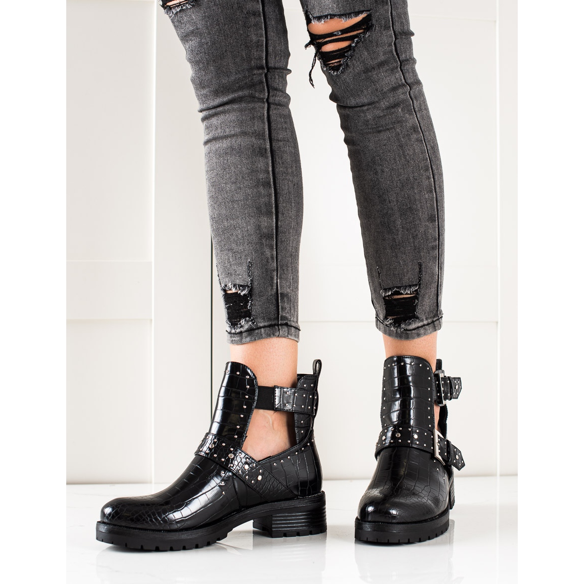 Wir präsentieren einzigartige Arbeitertaschen mit dekorativer Schnalle der Marke Bestelle, die durch Eleganz und Stil begeistern. Diese schwarzen Stiefeletten passen perfekt zu Alltags- und Abendoutfits und verleihen ihnen einen einzigartigen Rock-Charakter.