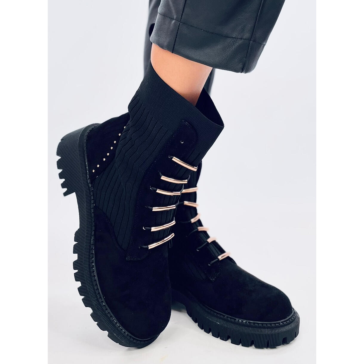 Moderne Arbeiter, die Komfort und modisches Design kombinieren. Das flexible, Socken Obermaterial passt sich perfekt an den Fuß an und erleichtert den ganzen Tag über das Anziehen und Komfort. Das ökologische Wildleder in Kombination mit dem Stoff betont das Qualitätsfinish, und goldene Bolzen, Strasssteine und subtile Strasssteine verleihen den Schuhen einen Charakter - dies ist ein absoluter Hit der Saison.