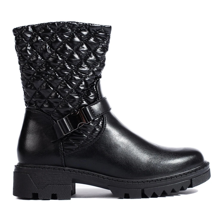 Elegante und praktische Arbeiter in einer schwarzen, gesteppten Ausgabe sind die perfekte Kombination aus Rockcharakter und alltäglichem Komfort. Die äußere Schicht des ökologischen Leders imitiert perfekt natürliches Material, und die dekorative Schnalle und die subtile Quilting verleihen den Schuhen einen modischen, ausdrucksstarken Stil. Dank der versteiften Befestigung und Reißverschluss an der Seite ist das Einfügen und Abpassen der Schuhe schnell und komfortabel.