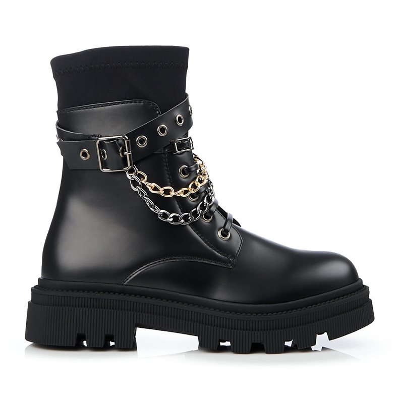 Wir präsentieren einzigartige Damenschuhe mit Ketten von Shelovet, die jeden Liebhaber modischer und bequemer Schuhe begeistern werden. Diese schwarzen Stiefeletten aus hochwertigem ökologischem Leder und Textilmaterial vereinen Eleganz und Rock-Stil und passen perfekt zu einem lässigen Alltagslook.