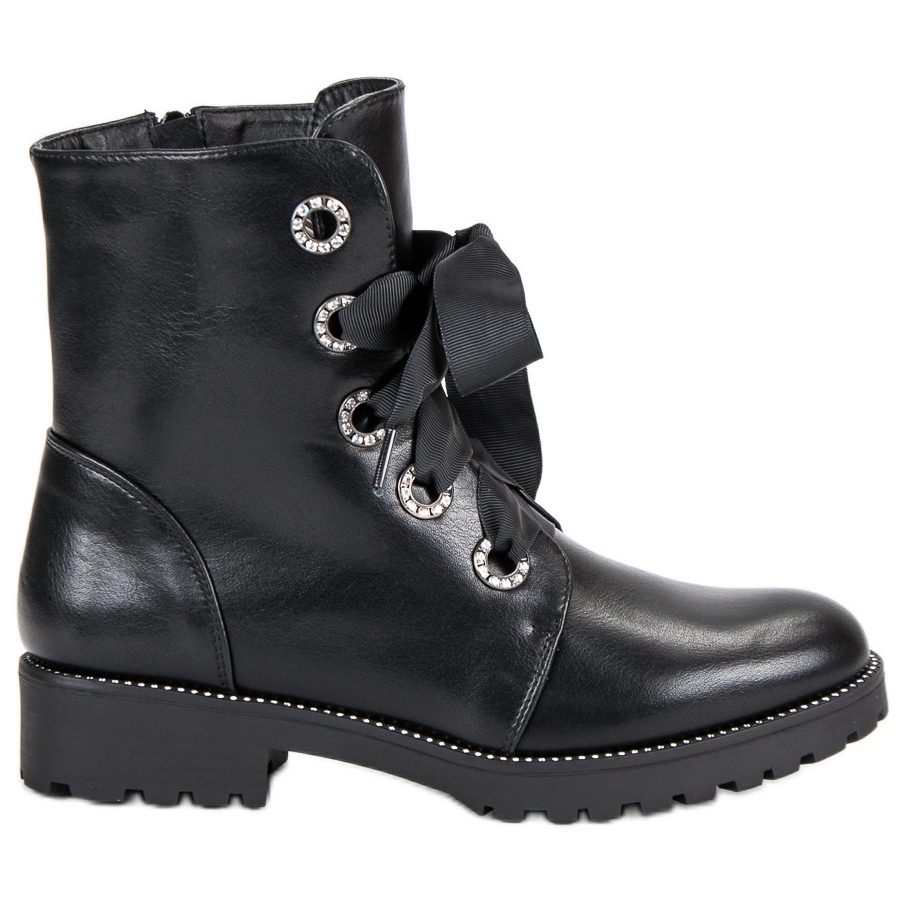 Schwarze Arbeiter zeichnen sich durch eine feste Sohle mit Profil aus, was ihre Stabilität und ihren Komfort beim Gehen beeinträchtigt. Eine breite Spitze und dekorative Strasssteine verleihen Charakter und einen modernen Stil. Mit runder Spitze und niedrigem Absatz eignen sich diese Schuhe perfekt für Stadtbummel und alltägliche Aufgaben.