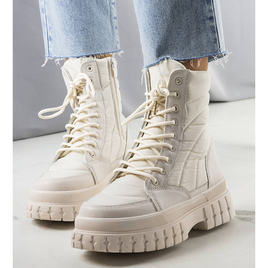 Stylische und praktische-diese beige Schneestiefel Arinna ist ein Muss in der Herbst/Winter-Saison. Das Obermaterial kombiniert hochwertige Stoff mit ökologischem Leder. Das Interieur ist mit einem warmen Vlies fertig, dank der die Schuhe perfekt vor Kälte schützen. Eine klassische, abgerundete Nase und eine flache Ferse machen das Modell jeden Tag bequem, und der beige Farbton können Sie leicht mit lässigen Stylisationen kombinieren.