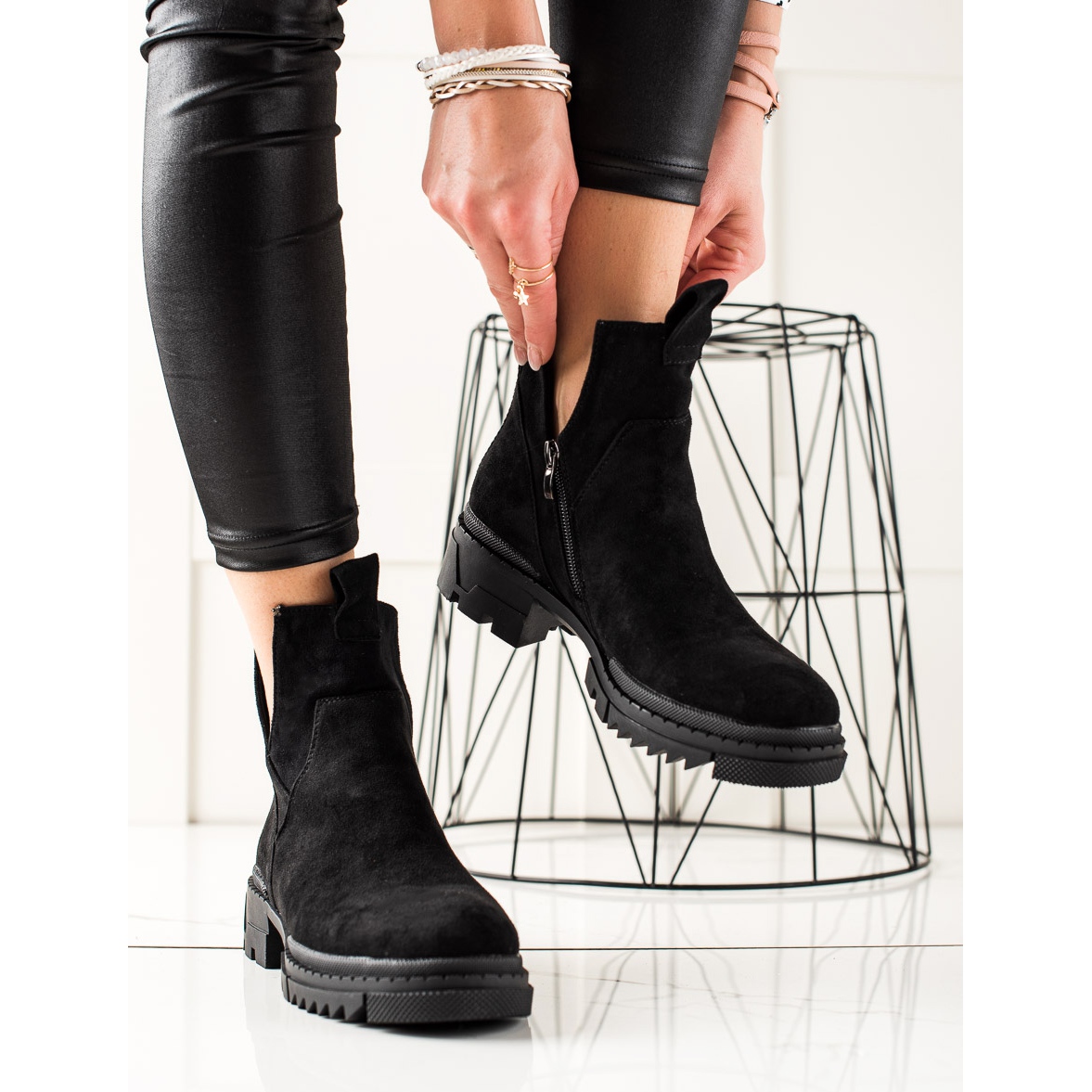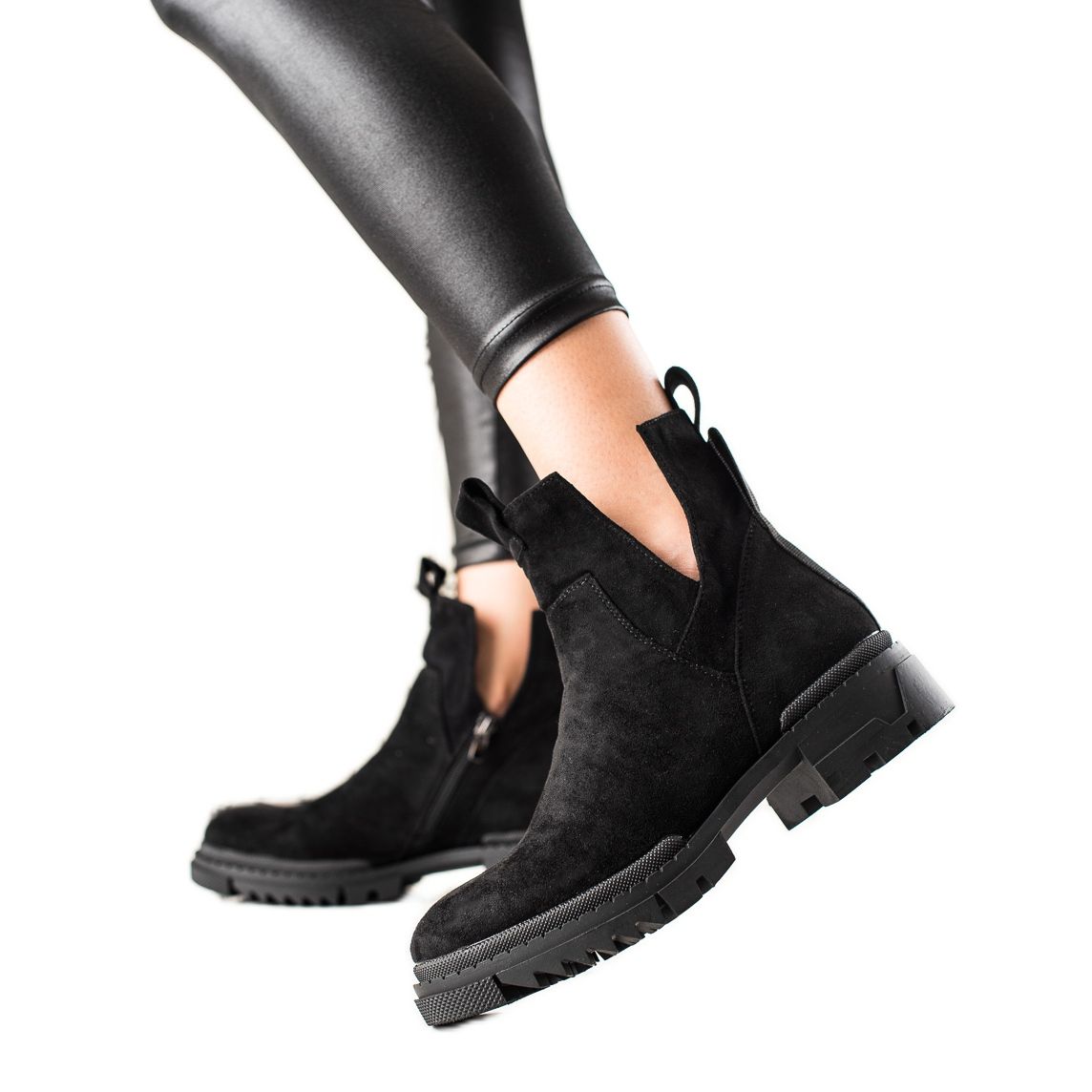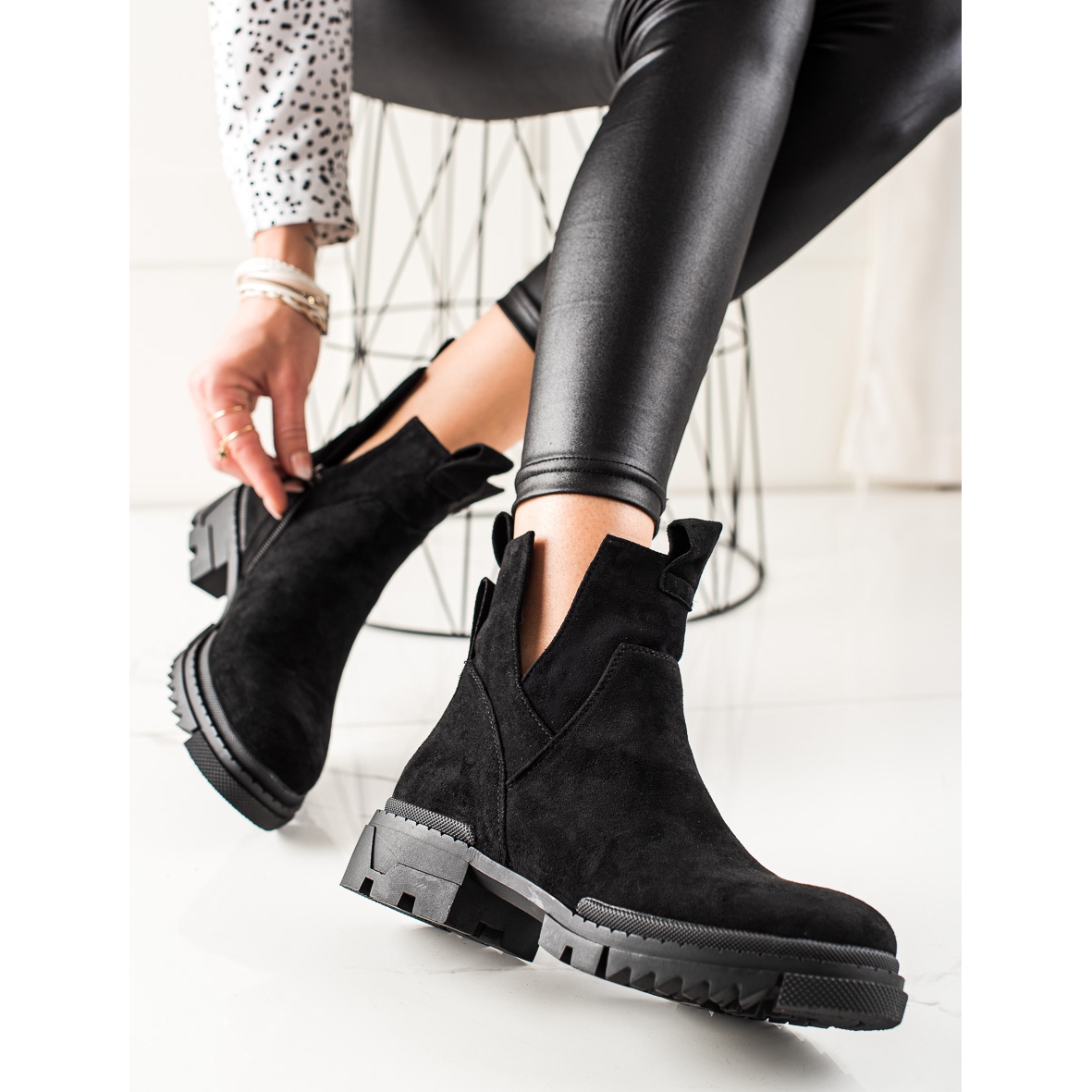 Entdecken Sie außergewöhnlichen Komfort und Eleganz dank der schwarzen Wildleder-Arbeiterstiefel mit Ausschnitt des Herstellers W. Potocki. Diese stilvollen Damen-Stiefeletten sind ein perfektes Alltagsmodell, das sich gut in Ihren Freizeitstil einfügt und sich sowohl für den urbanen als auch für den Alltagsstil eignet.