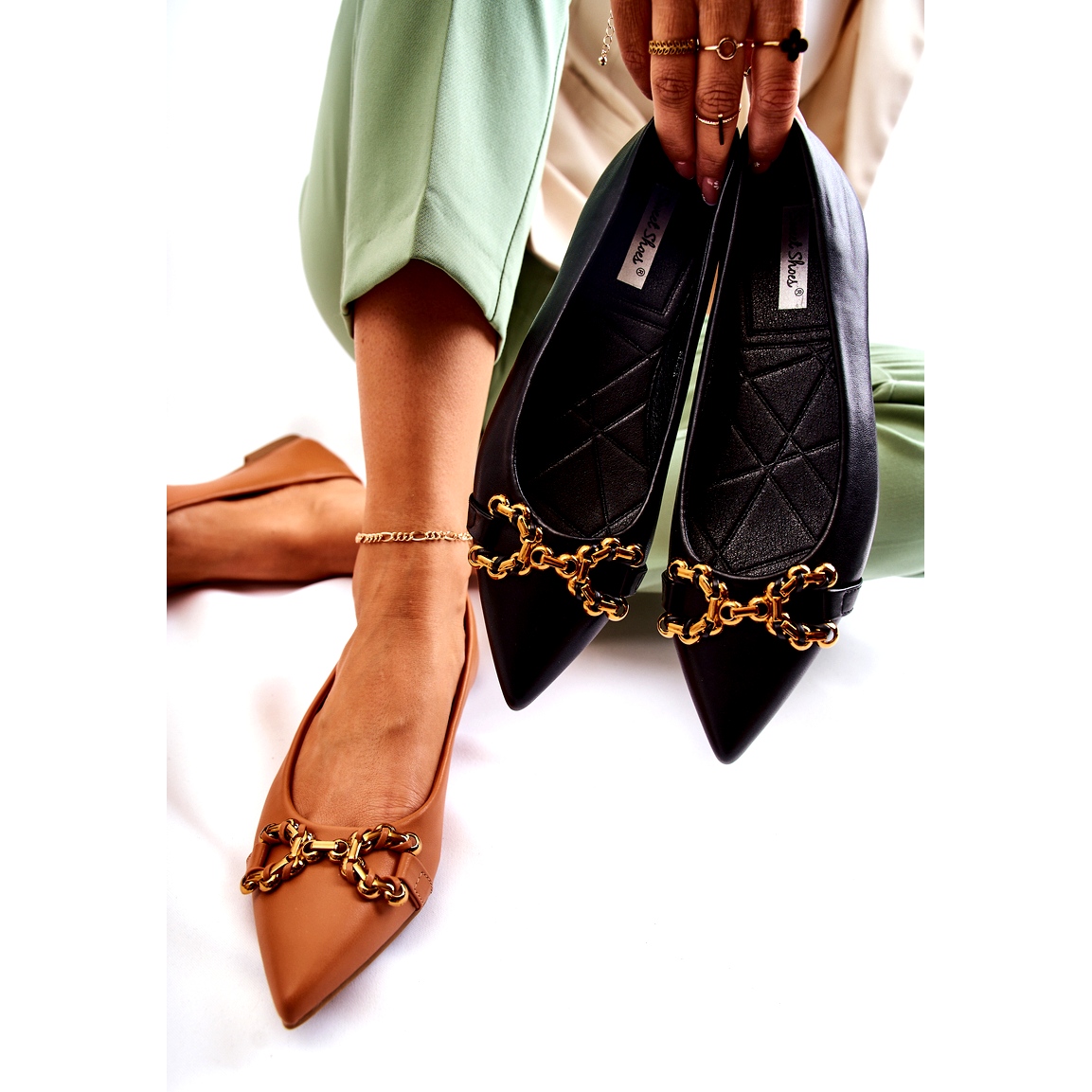 Die Ballerinas haben auf der Vorderseite ein schönes dekoratives Kunststoffelement, das ihnen Charakter verleiht und sie zu einer Ergänzung zu vielen verschiedenen Stilen macht – sowohl zu alltäglichen als auch zu eleganteren. Dank des flachen Absatzes und der rutschfesten Sohle genießen Sie nicht nur einen modischen Look, sondern auch Stabilität und sicheres Gehen den ganzen Tag über.
