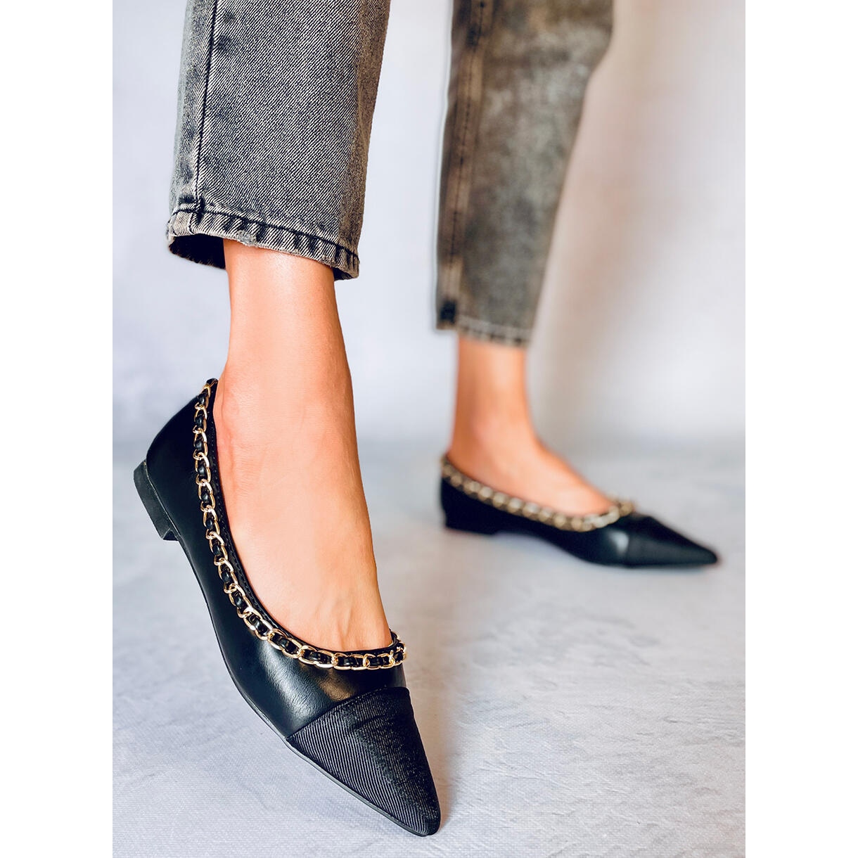 Entdecken Sie Eleganz und Komfort mit den Ballerinas Sabina Black mit Kette. Diese einzigartigen Damenschuhe kombinieren ein schlankes Design mit einer zarten, spitzen Zehenpartie, was ihnen einen dezenten und dennoch raffinierten Charakter verleiht. Die stylische Kette an der Oberseite ist ein modischer Akzent, der garantiert alle Blicke auf sich zieht.