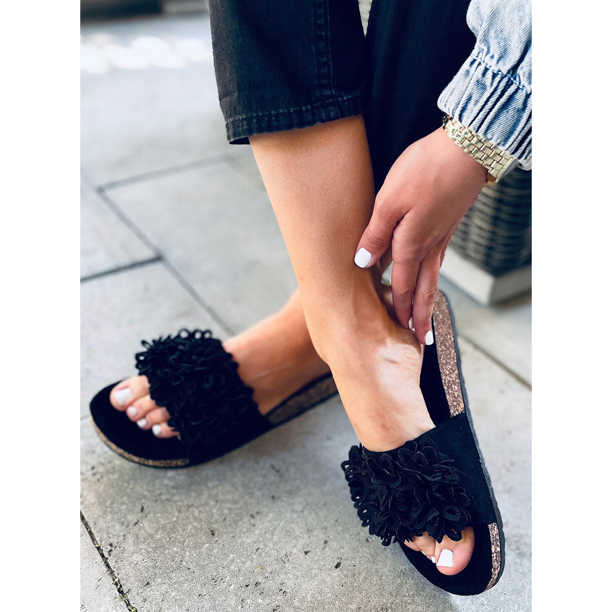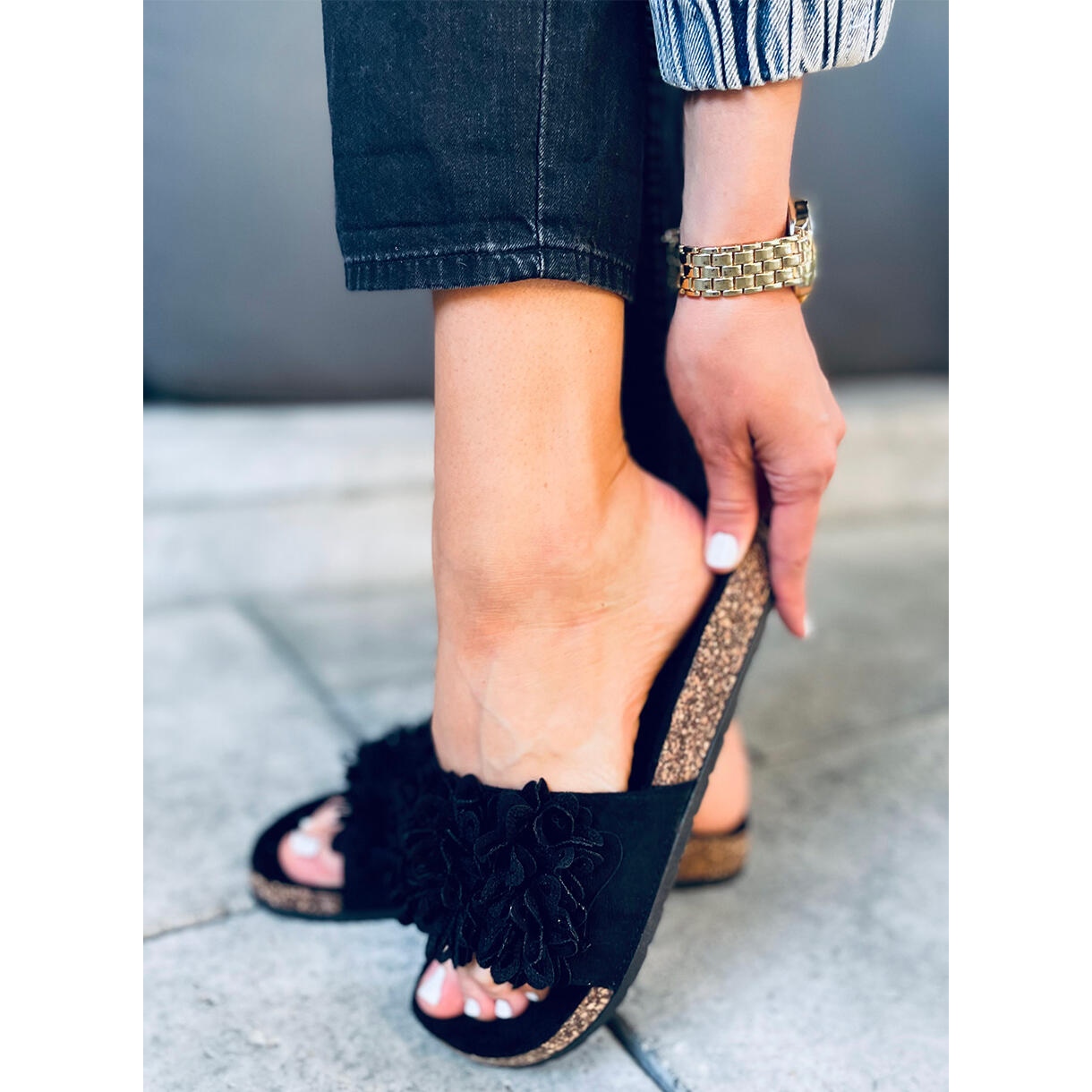 Entdecken Sie die perfekten Sommer-zehenstegsandalen – Berry Black Kork-zehenstegsandalen in Schwarz, die Eleganz und Komfort vereinen. Diese Damen-zehenstegsandalen aus hochwertigem, ökologischem Wildleder fallen mit einem dezenten, floralen Muster auf, das jedem Sommer-Styling Charme verleiht.
