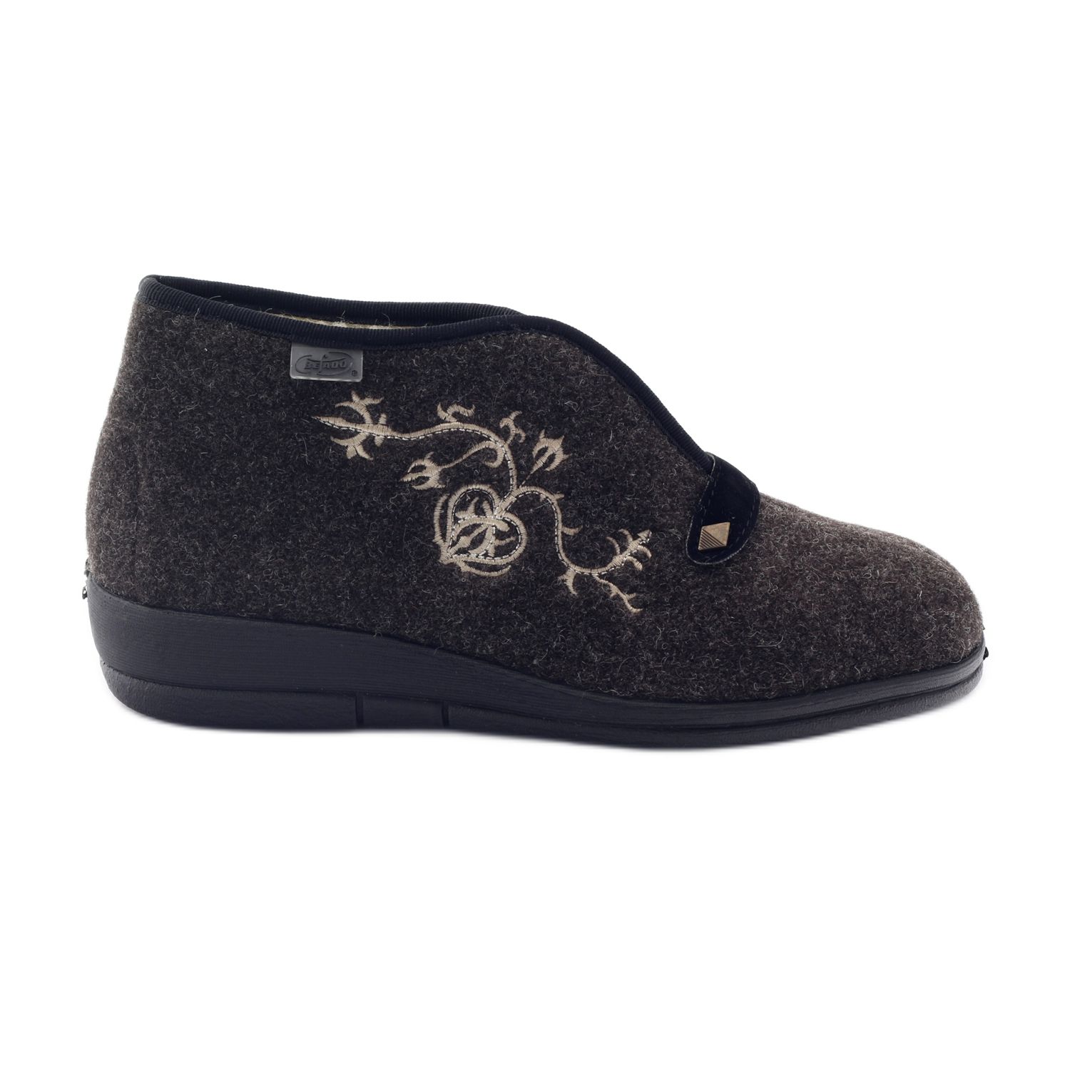 Befado-Hausschuhe sind hoch und ihre runde Spitze verleiht ihnen Charme. Die Absatzhöhe von 3 cm macht das Schuhwerk nicht nur stylisch, sondern sieht auch gut am Bein aus. Der Slip-On-Verschluss erleichtert das An- und Ausziehen, was ein zusätzlicher Vorteil ist.