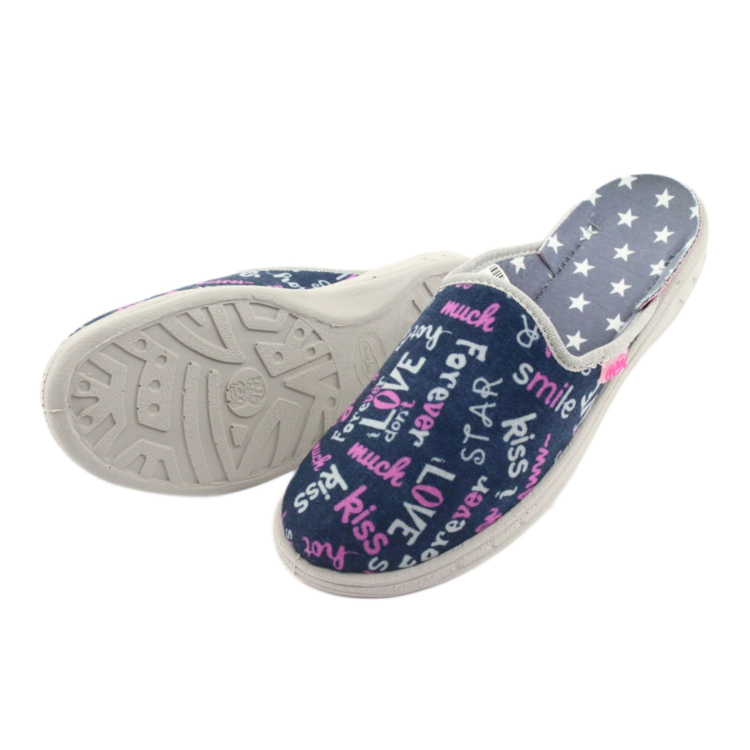 Die Farben der Schuhe sind ein Hingucker und entsprechen den neuesten Trends – die tiefe Marineblau-Farbe glänzt in Kombination mit weißen und rosa Aufschriften in englischer Sprache, die den Schuhen Charme und Charakter verleihen. Dies sind Hausschuhe, die sicherlich kleinen Fashionistas gefallen werden, die Wert auf Originalität und Stil legen.