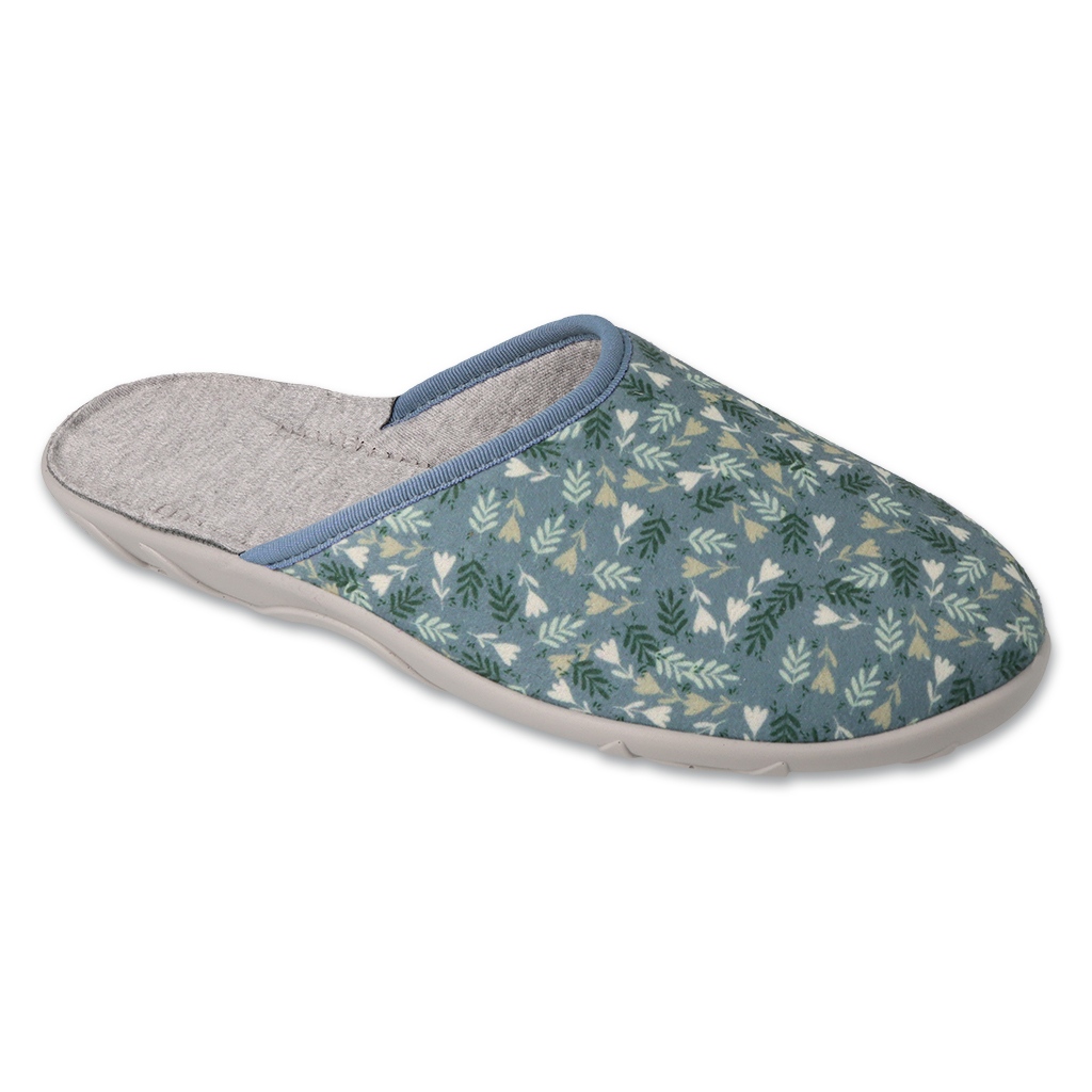 Bunte Befado 235d190 Pantoffeln sind eine Kombination aus Bequemlichkeit und weibliches Design. Graues Material, das vollständig mit einem kleinen, mehrfach gefärbten Blattmotiv bedeckt ist, verleiht dem Hauskostüm, unabhängig vom Alter des Benutzers, Frische und positives Charakter.