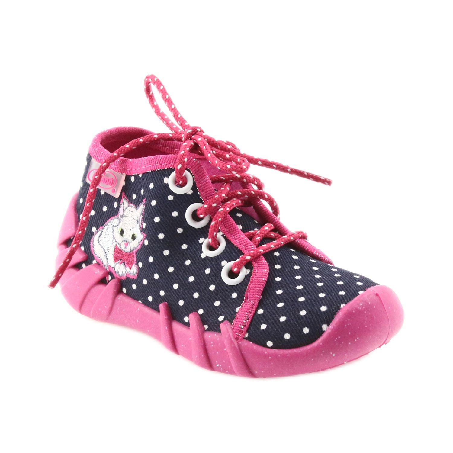 Diese bezaubernden Schuhe in Weiß, Rosa und Marineblau, verziert mit lustigen Punkten und einem Kätzchenmotiv, vereinen modernes Design mit Funktionalität. Sie bestehen aus hochwertigem Baumwollstoff und sorgen für eine ausreichende Belüftung, die für die Gesundheit der Kinderfüße von entscheidender Bedeutung ist. Dank der Verwendung von atmungsaktivem Material in der Sohle sorgen die Hausschuhe auch über längere Zeit für Hygiene und Komfort beim Tragen.