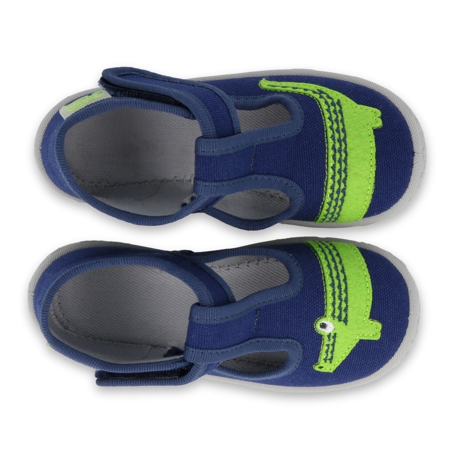 Die Farbe des Schuhwerks ist ein tiefes Marineblau, das sowohl universell als auch schmutzabweisend ist. Auf der Vorderseite des Schuhs, oberhalb der abgerundeten Zehen, befindet sich ein bezaubernder grüner Einsatz mit Krokodilmotiv, der sicherlich Kinder ansprechen wird, die sich für Tiere interessieren oder energiegeladene und lustige Ergänzungen zu ihrer Garderobe mögen.