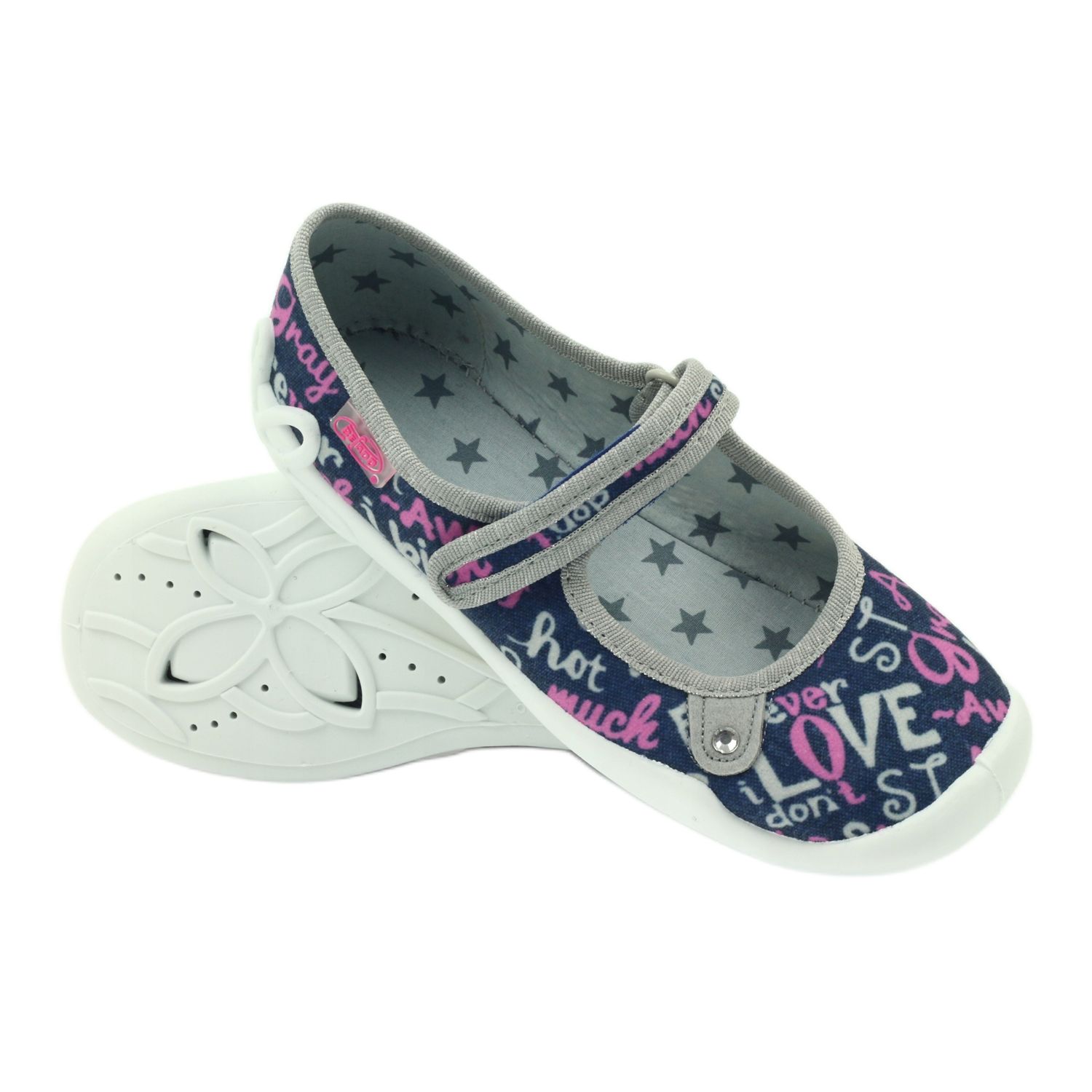 Befado Ballerina-Hausschuhe. 114y311 ist das perfekte Schuhwerk für kleine Mädchen, das modisches Design und hohen Tragekomfort vereint. Sie bestehen aus strapazierfähigem Denim-Stoff in einem wunderschönen Marineblau und sind mit farbenfrohen Aufschriften verziert, die ihnen einen einzigartigen Charakter verleihen. Diese entzückenden Hausschuhe eignen sich perfekt für die Schule, zu Hause oder im Garten und bieten den Füßen Ihres Kindes die Unterstützung, die sie brauchen.