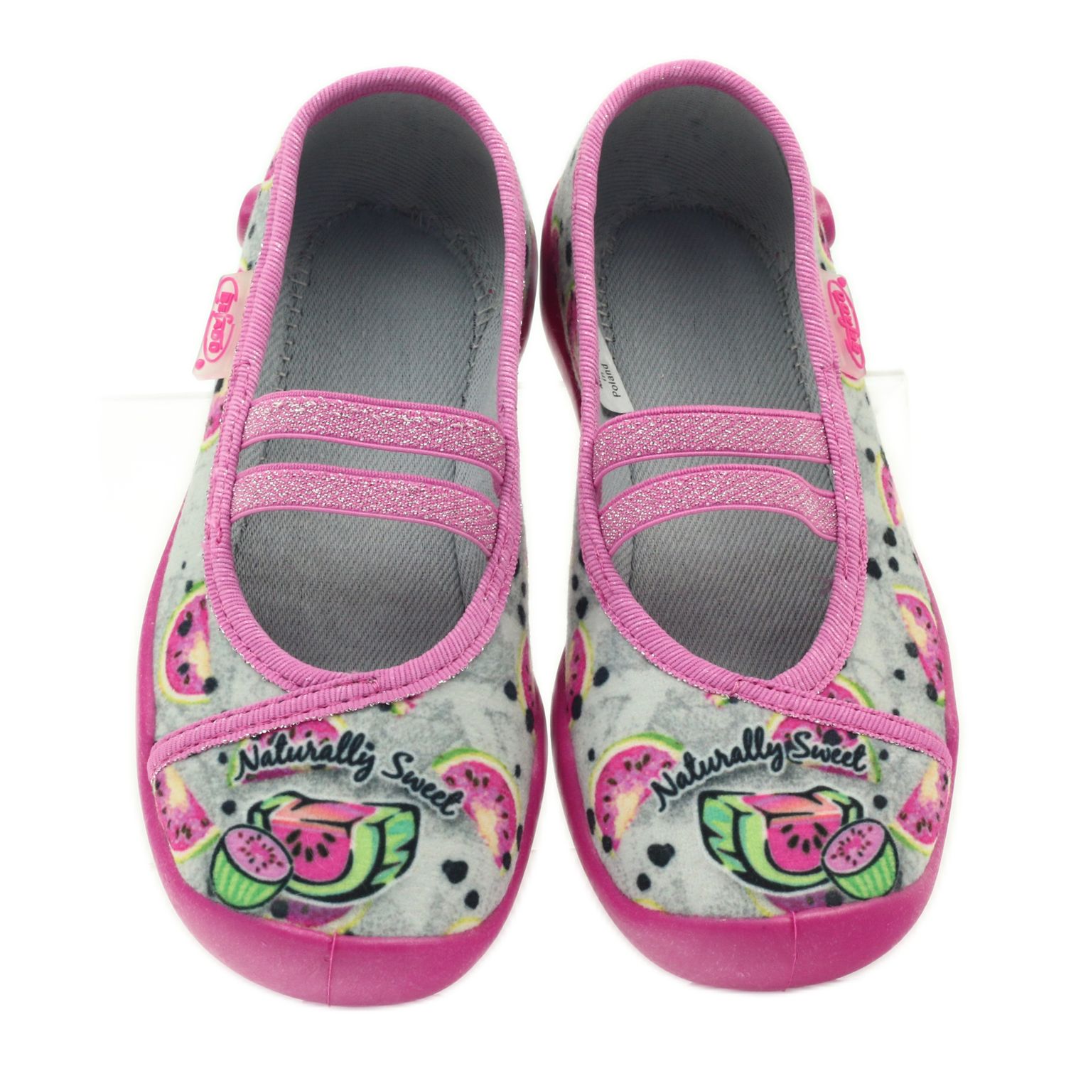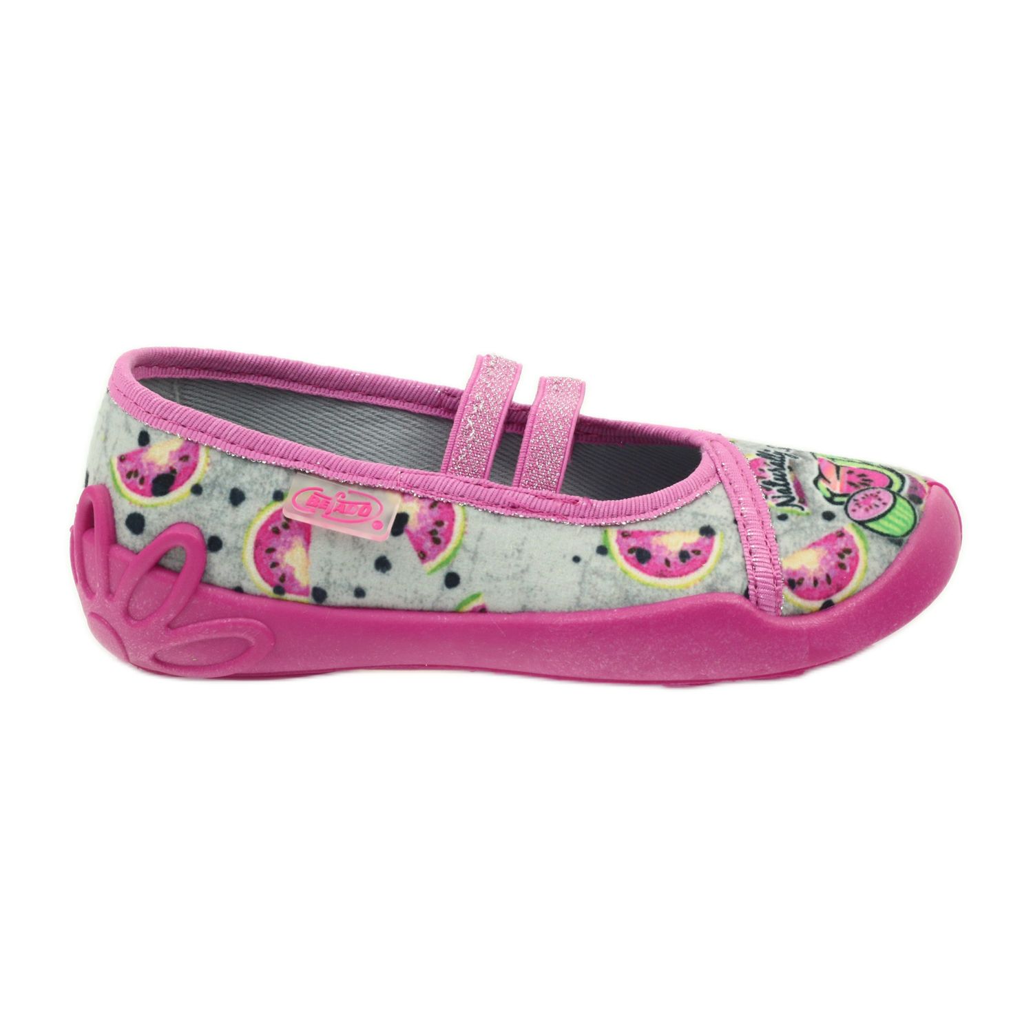 Diese Ballerinas zeichnen sich durch eine orthopädisch korrekte Sohle mit leicht erhöhtem Rand und höherem Absatz aus, die die Füße kleiner Mädchen bei ihren alltäglichen Abenteuern zusätzlich unterstützt. Ein Blumenmuster mit Wassermelonen auf grauem Grund verleiht ihnen Charme und zwei dekorative Gummibänder an der Oberseite machen die Hausschuhe noch eindrucksvoller.