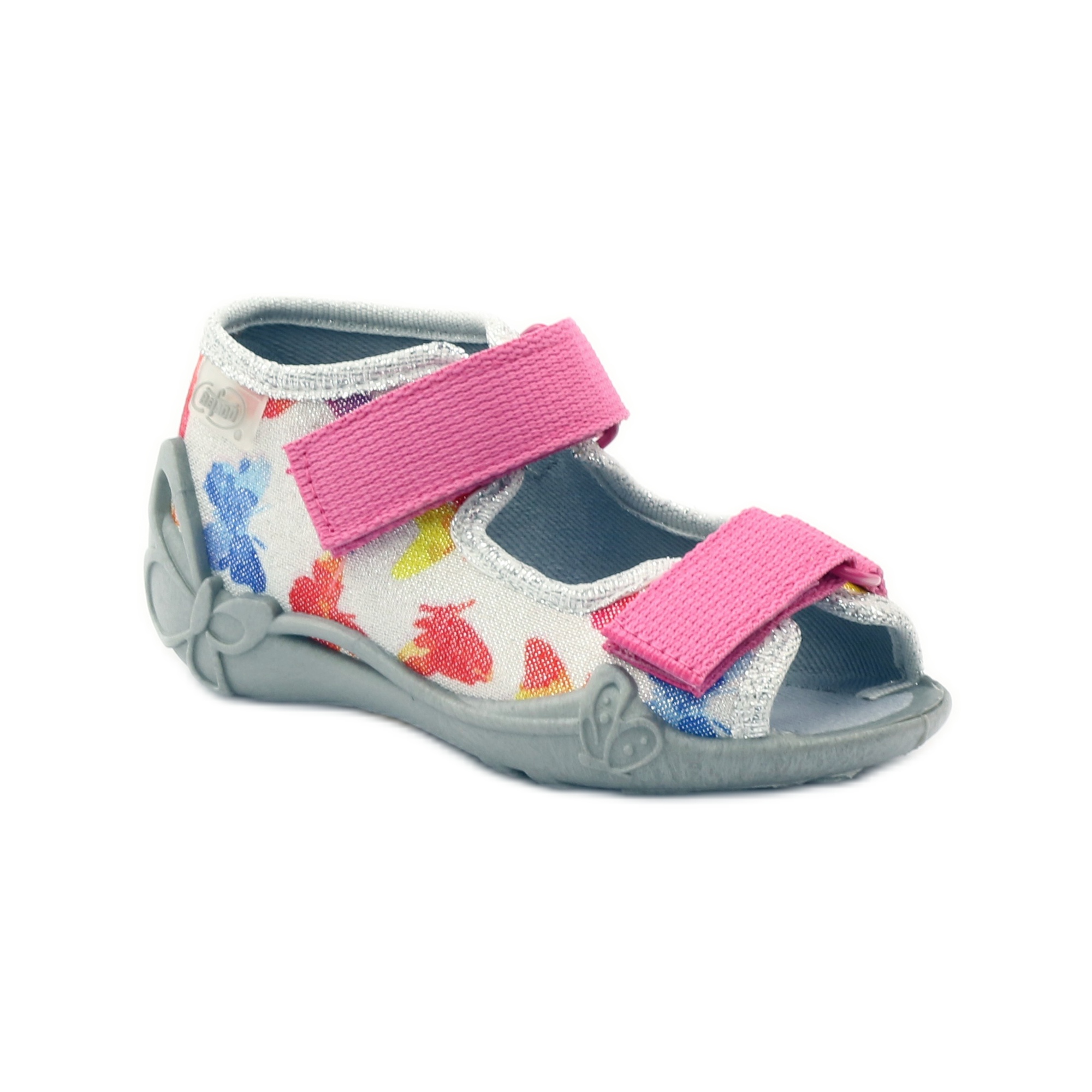 Sandalen Modell Befado. 242P075 ist eine ausgezeichnete Wahl für kleine Mädchen, die Wert auf Komfort und Stil legen. Diese rosa-grauen Hausschuhe, verziert mit bezaubernden schmetterlingsförmigen Applikationen, werden sicherlich jeder kleinen Fashionista gefallen.