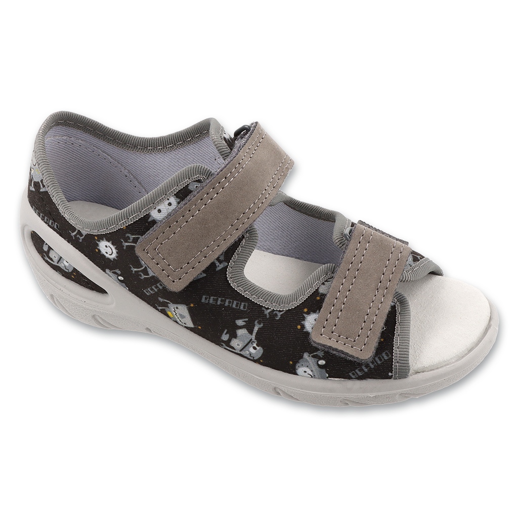 Hausschuhe aus dauerhaftem Stoff sind durch eine starre Ferse gekennzeichnet, die eine angemessene Fußunterstützung bietet und die Stabilität beim Gehen erhöht. Der Profile- und Ledereinsatz ist ein weiterer Vorteil dieses Modells, die die Bequemlichkeit und die Sorge um die ordnungsgemäße Entwicklung der Füße Ihres Kindes garantieren. Klettverschlüsse ermöglichen das Einziehen und Abnehmen einfach, was definitiv den täglichen Gebrauch erleichtert.