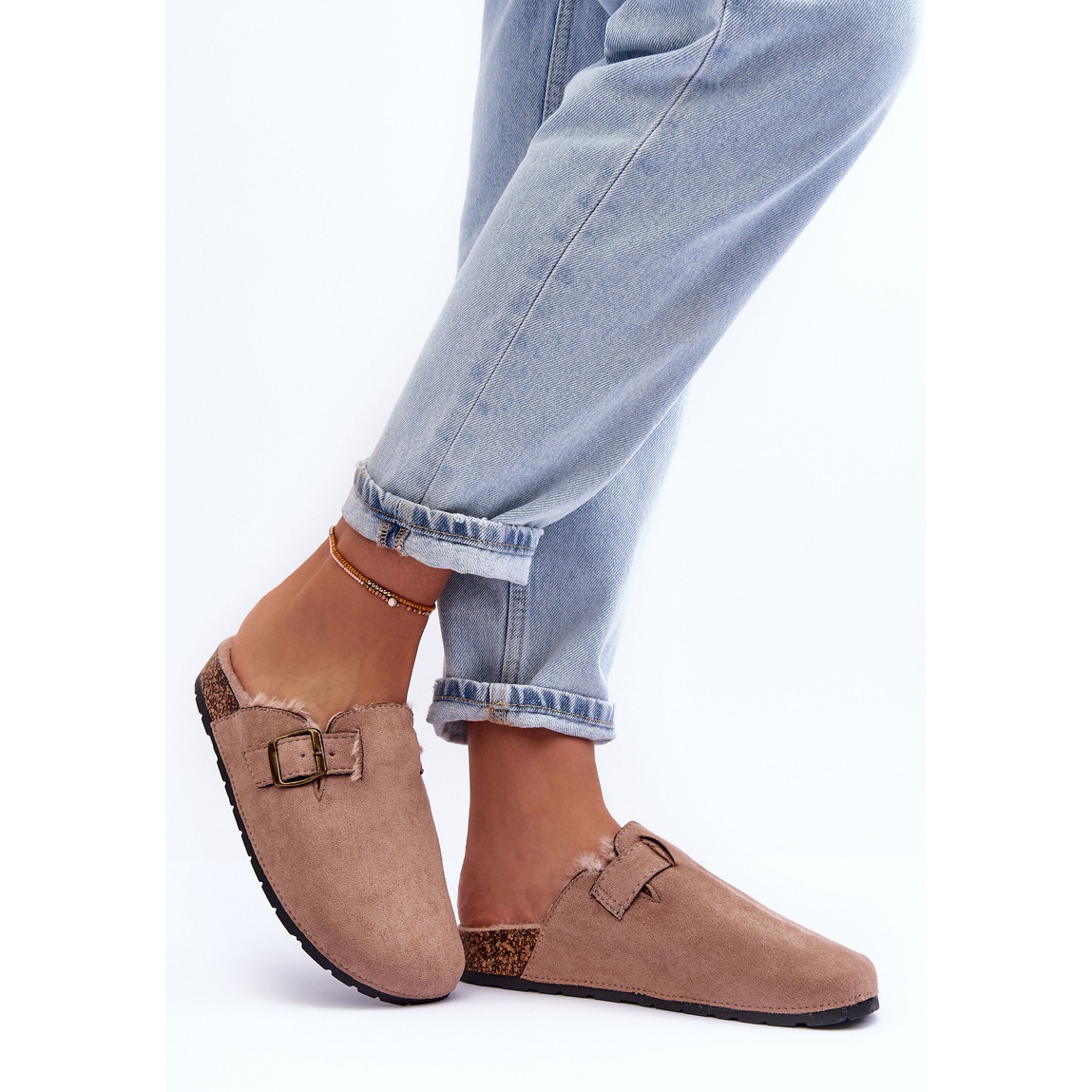 Stylische und komfortable zehenstegsandalen für Frauen aus Öko-Teil, perfekt für kühlere Tage. Das mit weiche Fell gepolsterte Innenraum bietet Wärme und Komfort -dank der gebauten Werkzeuge sind sie auch als häusliche Papellen großartig. Setzen Sie auf eine stabile Korkenplattform (3 cm) mit einer schwarzen Plastiksohle. Außerdem ermöglicht der Riemen mit der Schnalle, sie mit dem Fuß anzupassen.