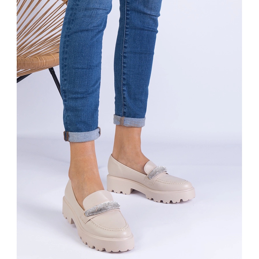 Wir präsentieren beige Frauenlaafer, die mit Zirkonen verziert sind - ein ideales Angebot für Frauen, die Eleganz und Komfort schätzen. Diese stilvollen Schuhe einer seriösen Marke kombinieren modisches Design mit Funktionalität, was sie sowohl täglich als auch für formellere Anlässe zu einer großartigen Wahl macht.