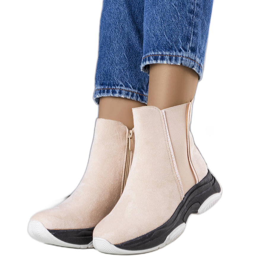 Elegant, Frauenstiefel in einer universellen beige Farbe (beige), bestehend aus ökologischem Wildleder. Das Innenraum mit einem weichen, warmen Fell bietet Komfort und thermische Isolierung, dank dessen, was das Modell in der Herbst- und Wintersaison großartig ist. Die eingefügte Struktur und die abgerundete Nase tragen die Bequemlichkeit des täglichen Gebrauchs bei, und die 3,5 -cm -Plattform betont die modische, sportliche Natur der Schuhe.