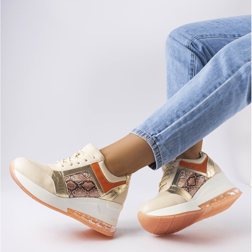 Die aus hochwertigem ökologischem Leder gefertigten Sneaker bieten nicht nur ein ästhetisches Aussehen, sondern auch Haltbarkeit. Ein zusätzlicher Vorteil ist der praktische Keilabsatz, der den Füßen Stabilität und Halt gibt. Durch die beige Farbe mit goldenen Akzenten passen diese Schuhe perfekt zu verschiedenen Stilrichtungen, sowohl lässig als auch eleganter.