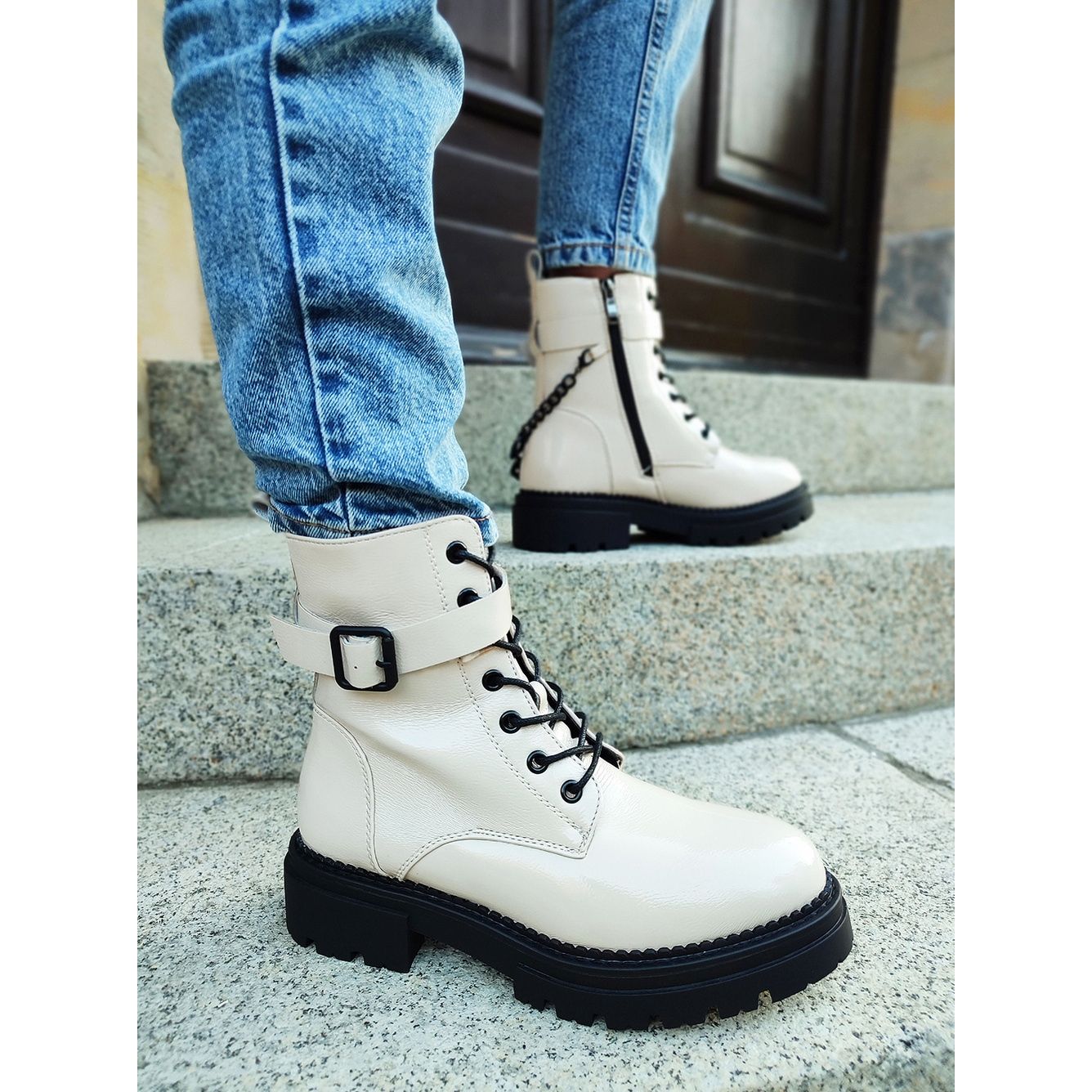Elegante Arbeiter aus lackiertem ökologischem Leder in einer universellen beige Farbe. Ein Modell, das eine rohe militärische Figur mit einer weiblichen Note kombiniert, dank einer glänzenden Oberfläche und einer dekorativen, abnehmbaren Kette. Perfekt für kühlere Tage - isoliert, Knöchel, komfortabel und leicht zu passen dank Schnürung und Reißverschluss.