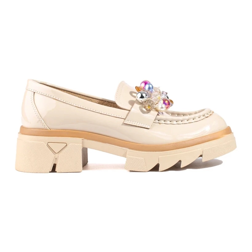 Details: Beige lackierte Damenschuhe mit dicker Sohle von Shelovet