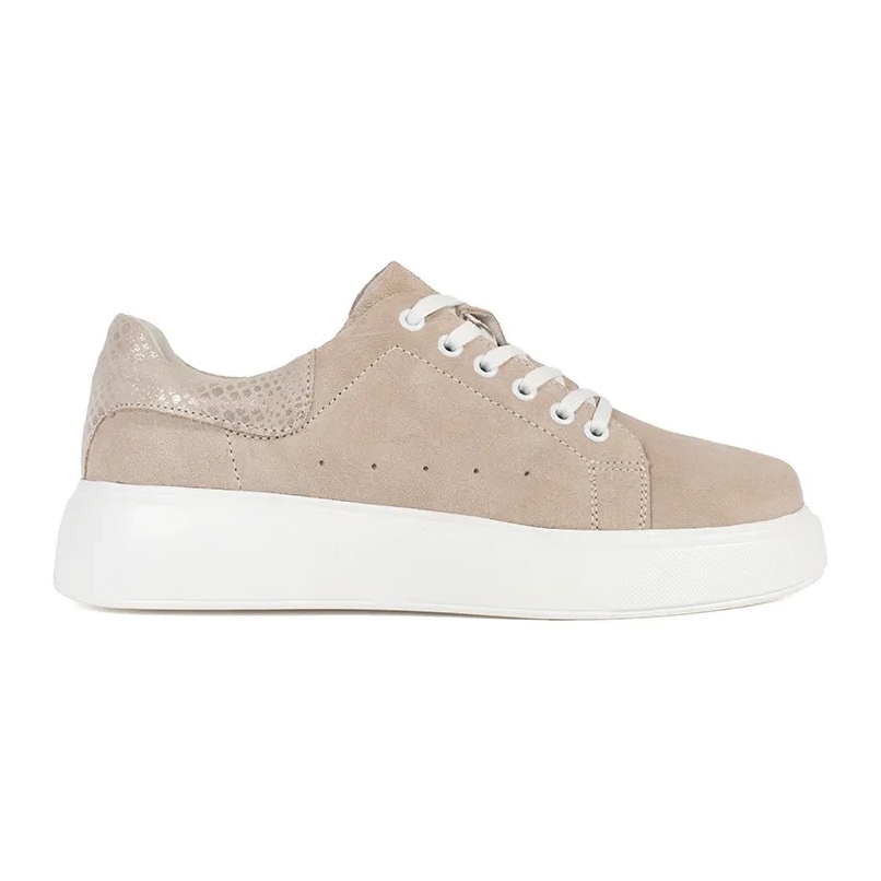 Diese Turnschuhe sind nicht nur funktional, sondern auch praktisch - der Verschluss der Schnürsenkel ermöglicht die individuelle Anpassung, und die 3 cm hohe Plattform mit dem Profil schützt vor Ausrutschen verschiedener Oberflächen. Beige Farbe ist eine ausgezeichnete Basis, die zu vielen Stilen passt, was diese Schuhe zu einer vielseitigen Ergänzung zu jeder Garderobe macht.