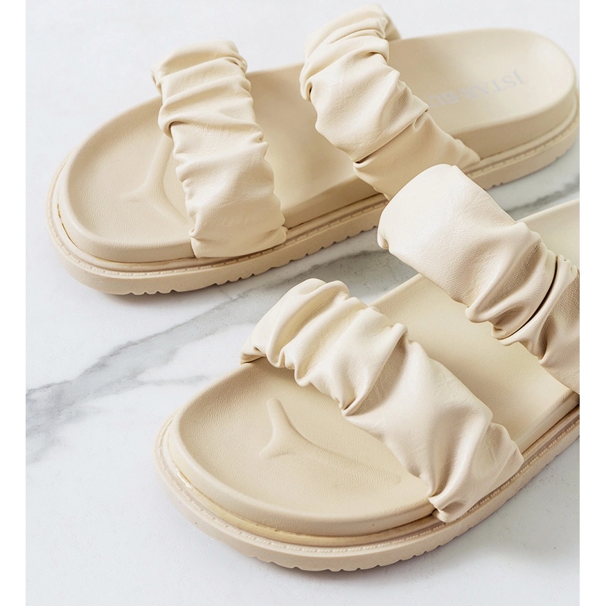 Minimalistische, elegante Beige -Buzzo -Flip -Flops sind jeden Tag eine gute Wahl. Das zerknitterte obere obere aus hochwertige ökologische Leder verleiht Charakter und passt in aktuelle Trends, und die Gummi -Sohle und der Einsatz bieten den ganzen Tag aus Komfort. Hausschuhe auf der 2,5 -cm -Plattform verlängern die Figur optisch und behalten die Stabilität und die Nutzung der Nutzung bei.