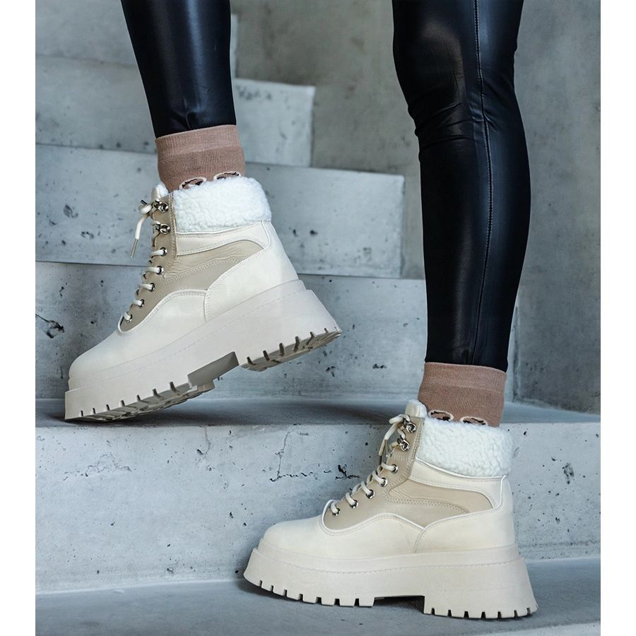 Beige Trapper auf einer dicken Sohle mit Fell ist ein Muss in jeder Frauengarderobe für die kommende Saison! Diese stilvollen Schuhe kombinieren modisches Design mit Funktionalität, was sie zur perfekten Wahl für Wintertage macht. Dank des erwärmten und hohen Knöchelmeisters bieten sie auch an den kältesten Tagen Komfort und Wärme.