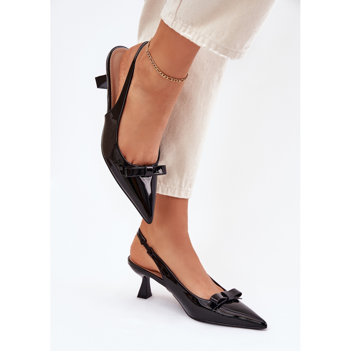 Entdecken Sie Eleganz und Weiblichkeit mit lackierten Sandalen auf einem Stift mit einem Bug in einer klassischen schwarzen Farbe. Diese einzigartigen Frauensandalen aus hochwertigem Öko -Leder sind eine gute Wahl für besondere Anlässe. Ihre spitzen Nasen verleihen der Figur Schlankheit, und der subtile Bogen, der vorne platziert ist, verleiht ihnen einen einzigartigen Charme.