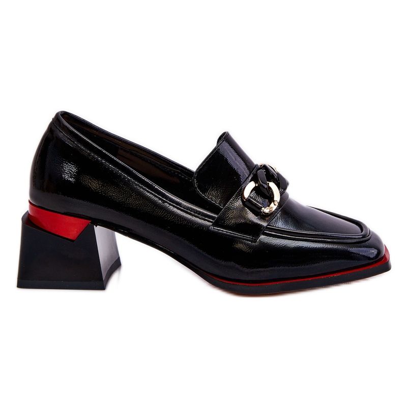 Elegante und komfortable Pumpen mit einem universellen, zeitlosen Schnitt - ideal für das Büro und die Ausgaben. Das "Valenti" -Modell kombiniert eine klassische Form mit einem modernen, lackierten Finish und einer subtilen Dekoration in Form einer Plastikkette. Eine niedrige, stabile Ferse des Blocks und ein weicher Einsatz natürlicher Leder sorgen für den ganzen Tag über den Komfort, und die versteifte Ferse stabilisiert den Fuß beim Gehen.
