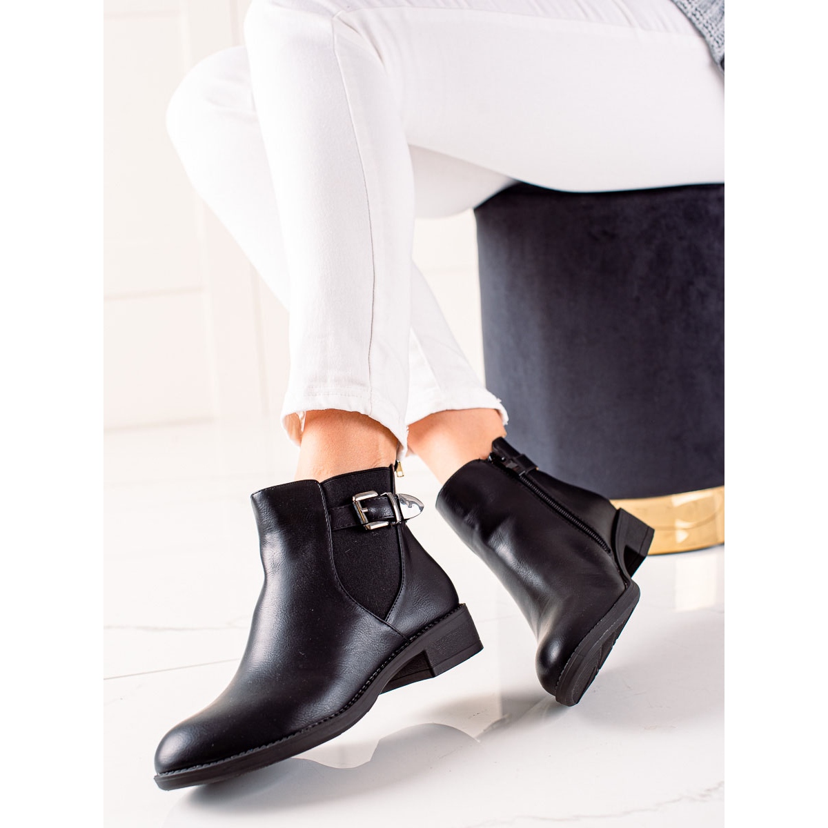 Die Sohle aus synthetischem Material sorgt für guten Halt und der flache, 3 cm hohe Absatz sorgt für dezenten Charme, ohne auf Komfort zu verzichten. Ein zusätzlicher Vorteil der Stiefel ist die dekorative Schnalle, die ihnen Charakter verleiht. Der Reißverschluss erleichtert das Anziehen, was im Alltag äußerst wichtig ist.