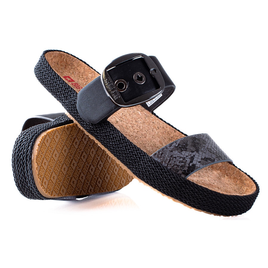 Elegante, schwarze Frauen -Slipper -Marken Big Star für Komfort und universelle Stil. Ein einfaches, gestaltetes Design macht das Modell perfekt zu vielen Sommerstilisierungen - von Freizeitsets mit Jeans bis hin zu hellen Kleidern und Shorts.