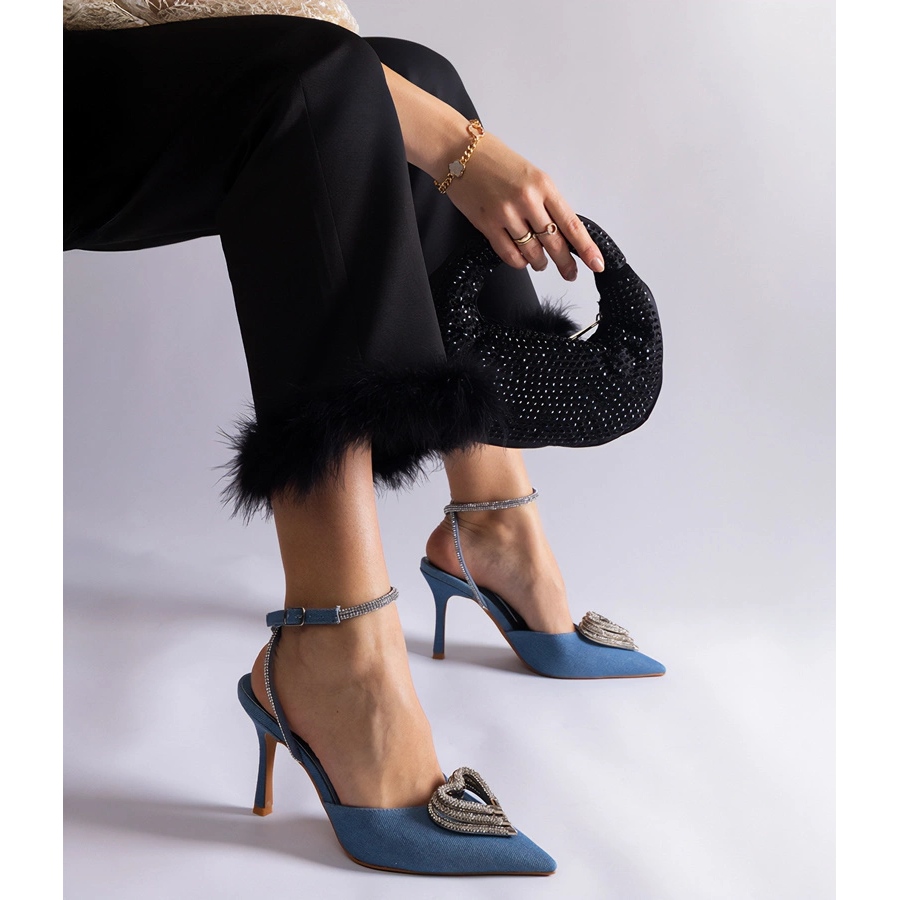 Details: Blaue High Heels mit offenem Absatz, verziert mit Zirkonen