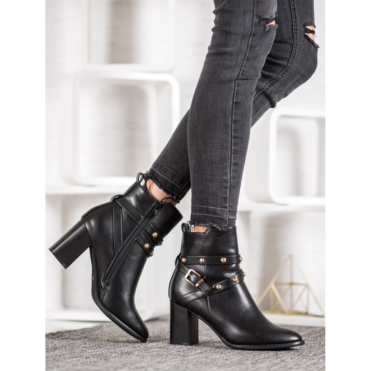 Details: SDS Booties auf einem Pfosten mit Strasssteinen schwarz