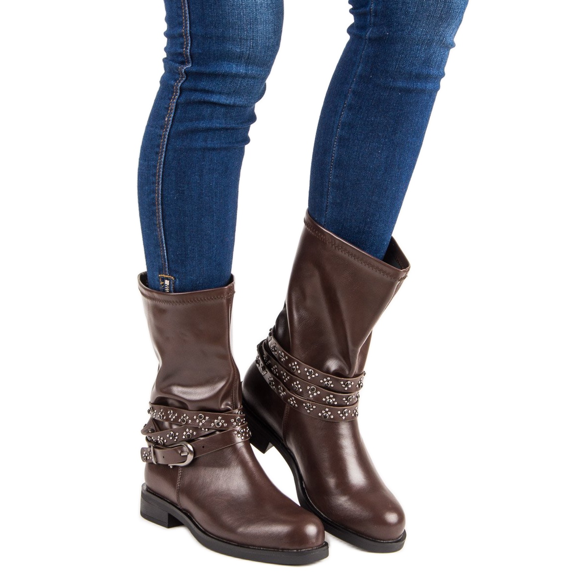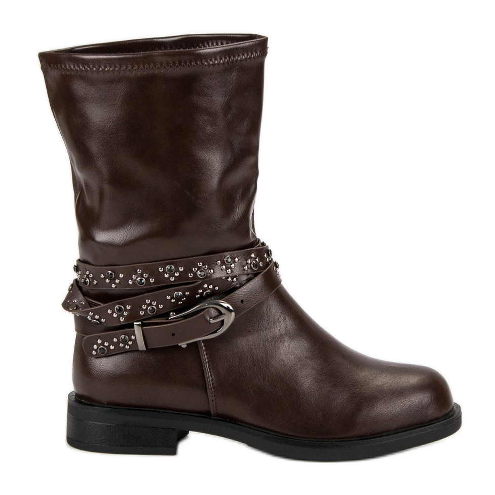 Die Small Swan Brown Worker zeichnen sich außerdem durch Details wie Strasssteine und eine dekorative Schnalle aus, die ihnen Charakter verleihen und sie perfekt zu Rock- und Casual-Style-Trends passen lassen. Dank der Schafthöhe von 23 cm und der Breite von 38 cm schmiegen sich diese Stiefel perfekt an den Knöchel an, ohne die Füße zu wärmen, wodurch sie auch für kältere Tage geeignet sind.
