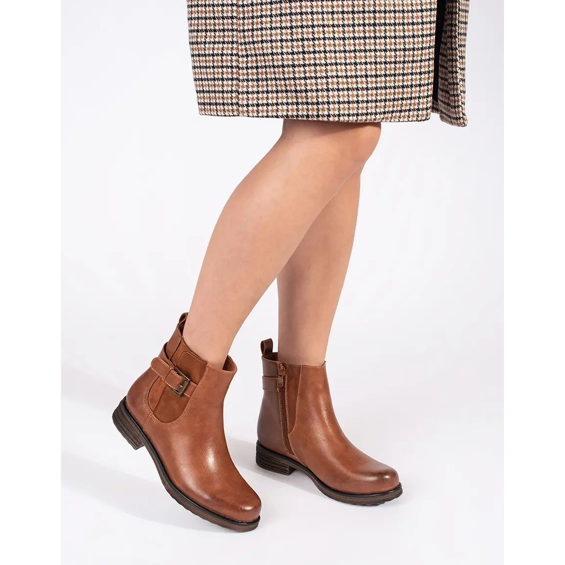 Details: Braune Damenstiefeletten mit Schnalle am niedrigen Absatz