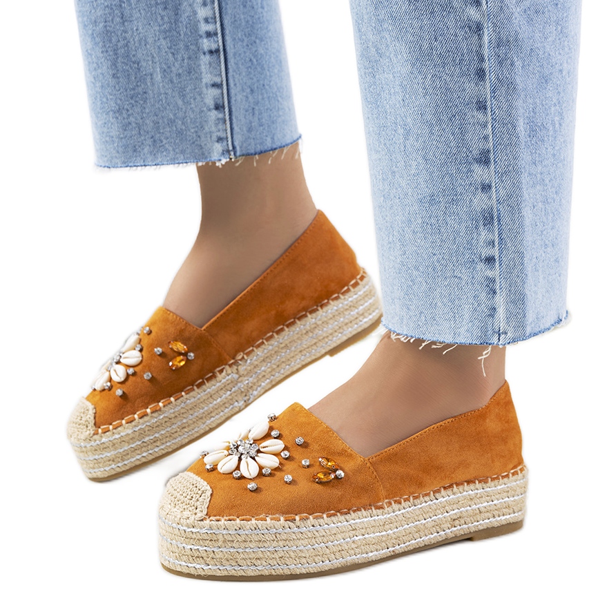 Die braunen Espadrilles von Frau Nicki mit dicker Sohle sind die perfekte Wahl für Sommertage. Diese eleganten Schuhe zeichnen sich durch ein mit Muscheln und Strasssteinen verziertes Obermaterial aus, das ihnen einen einzigartigen Charakter verleiht. Dank ihnen gewinnt jedes Styling an Charme und Originalität.