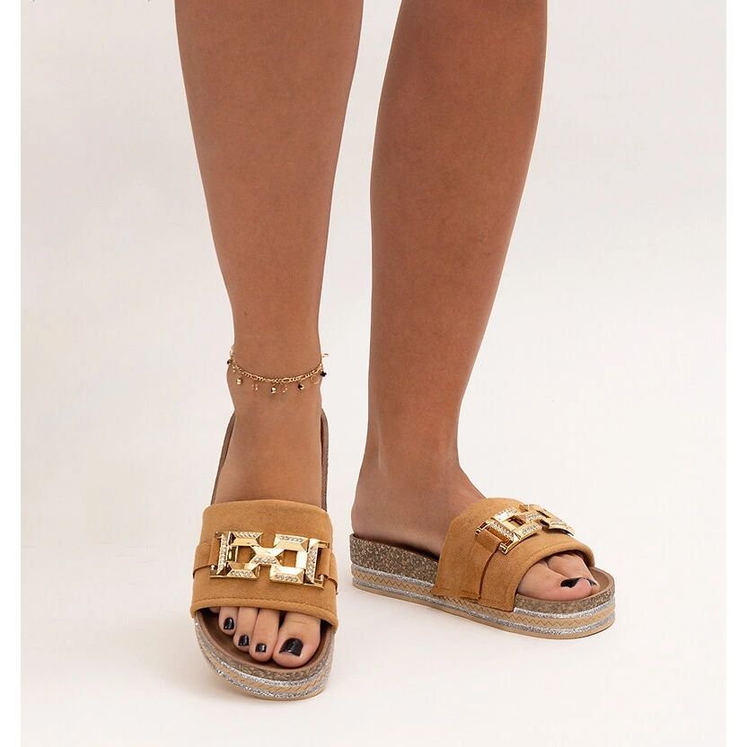 Eine mit Zirkonen verzierte glänzende Schnalle ist ein charakteristisches Element, das diesen Klappen einen Designercharakter verleiht. Sie mischen sich in Sommerstilisierungen, zeichnen ihre Augen und betonen Ihren einzigartigen Stil. Eine flache Ferse mit einer Höhe von 4 cm garantiert den ganzen Tag den Komfort.