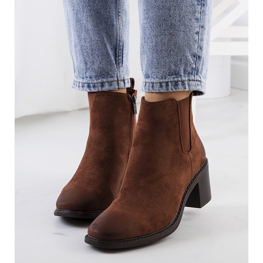 Luiza Brown High Heels - Eleganz und Komfort für kühlere Tage. Der klassische Schnitt mit einer abgerundeten Nase und einem stabilen Pfosten (6,5 cm) prägt die Figur perfekt und das ökologische Leder von Wildleder im Schatten des Brauns verleiht dem raffinierten Charakter -Styling. Die Stiefel greifen nach dem Knöchel (Höhe ca. 17 cm) und sind mit weichem Fell isoliert, was in der Herbst/Winter -Saison den thermischen Komfort garantiert.