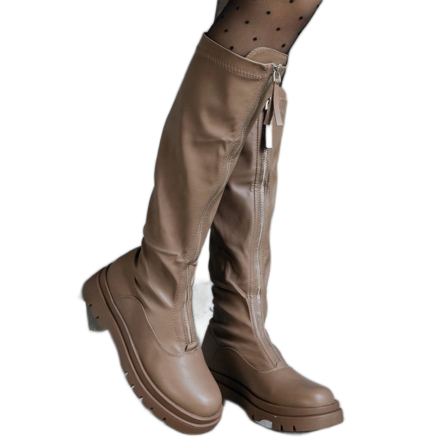 Sie haben eine Kniehöhe (49 cm) und eine runde Nase, die nicht nur ihren Stil betont, sondern auch beim Tragen Komfort bietet. Dank der Reißverschlussbefestigung, dem Anziehen und Entfernen von Stiefeln ist es schnell und komfortabel. Die braune Farbe, bekannt als Khaki, und die braune Gummi -Sohle sind die perfekte Kombination, die den Charakter jeder Stilisierung verleiht.