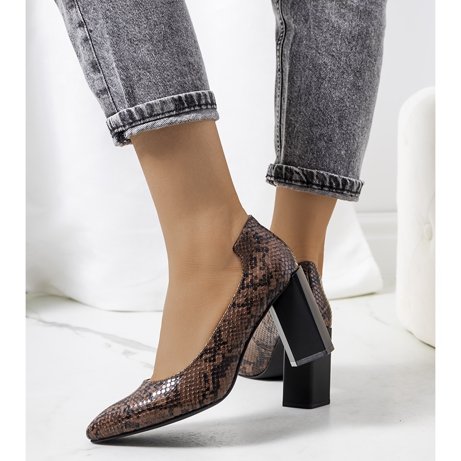 Braune Ajla-Pumps mit hohen Absätzen sind die perfekte Wahl für Frauen, die Eleganz mit außergewöhnlichem Komfort verbinden möchten. Das Modell Ajla zeichnet sich durch einen originell geformten Absatz aus, der in Kombination mit einem modischen Schlangenmotiv den Schuhen einen einzigartigen Charakter verleiht.