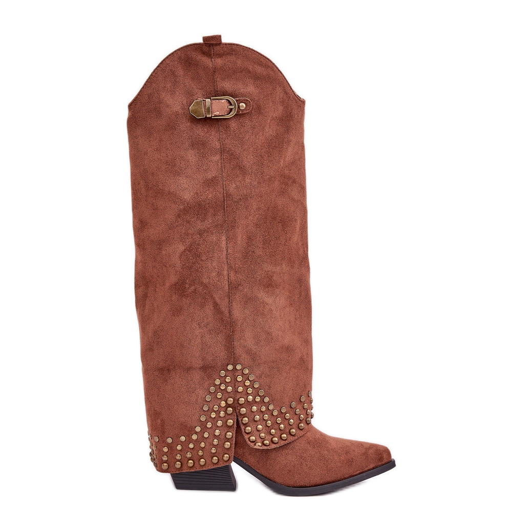 Stiefel mit einem erhöhten Obermaterial auf einem braunen Pfosten sind ein ideales Angebot für Frauen, die modischen Stil mit Komfort kombinieren möchten. Diese eleganten Stiefel aus hochwertigem Öko -Wildleder passen perfekt zu aktuellen Trends, während sie das ursprüngliche Design dank eines hochgezogenen Obermateriales anbieten, das mit Strasssteinen und einer eleganten Schnalle verziert ist.